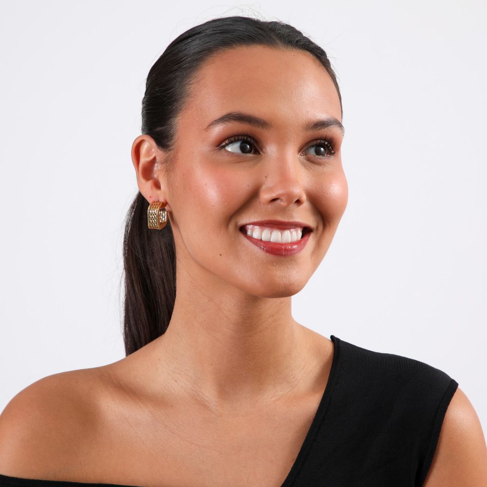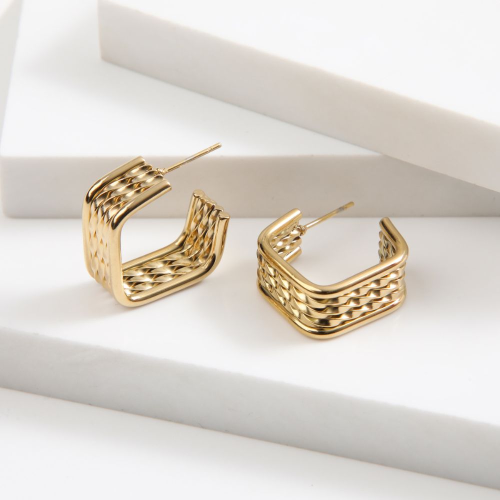 Aro tipo argolla dorada y cuadrada. Es de acero y bañada en oro. Producto hipoalergénico.