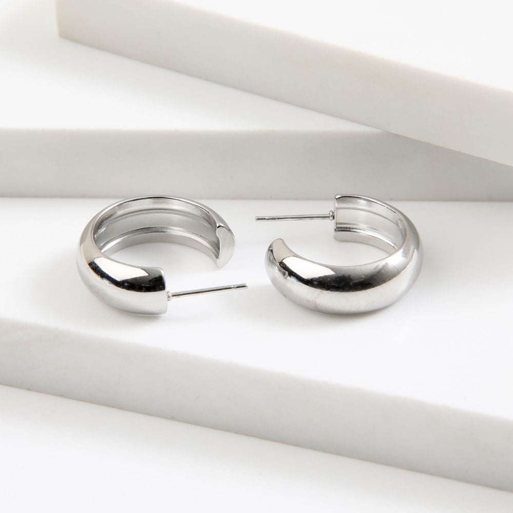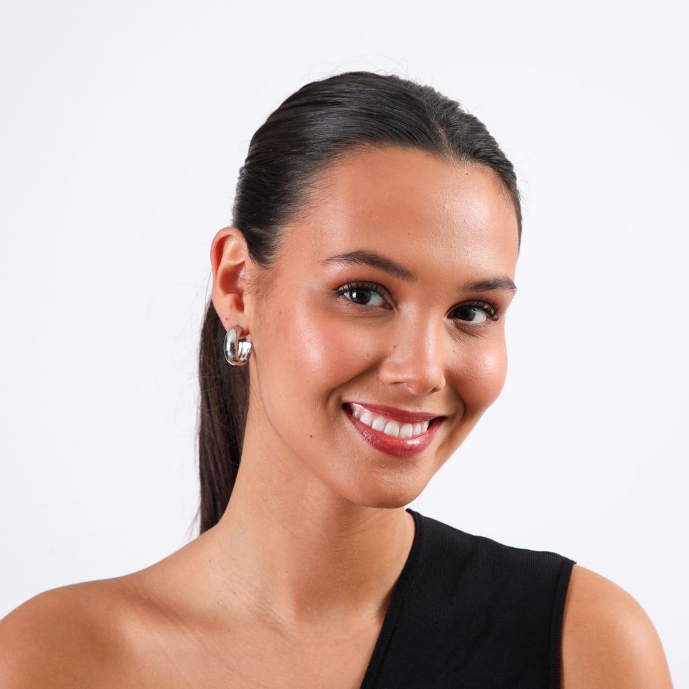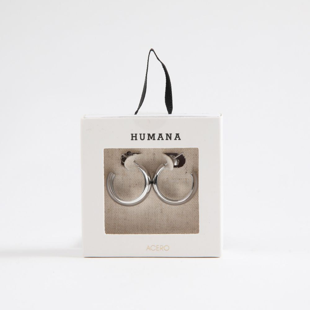 Aro tipo argolla mediana, lisa y plateada, de acero y es hipoalergénico.