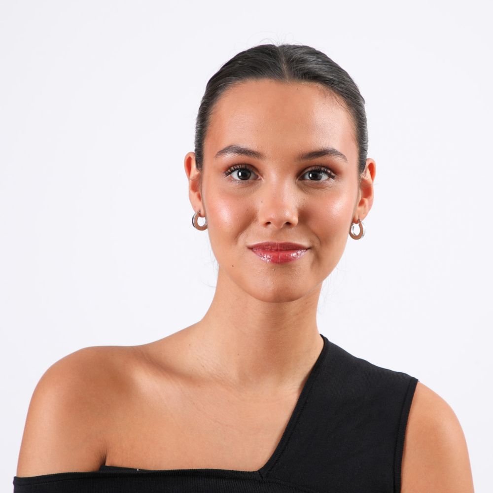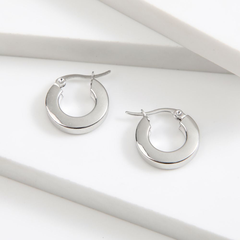 Aro tipo argolla lisa y plateada, de acero y es hipoalergénico.