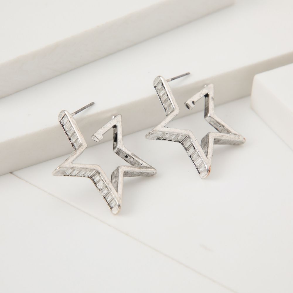 Aros de argolla en forma de estrella plateada con brillantes de fantasía en el exterior.