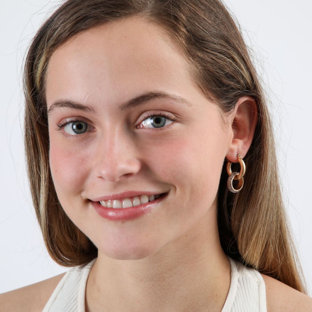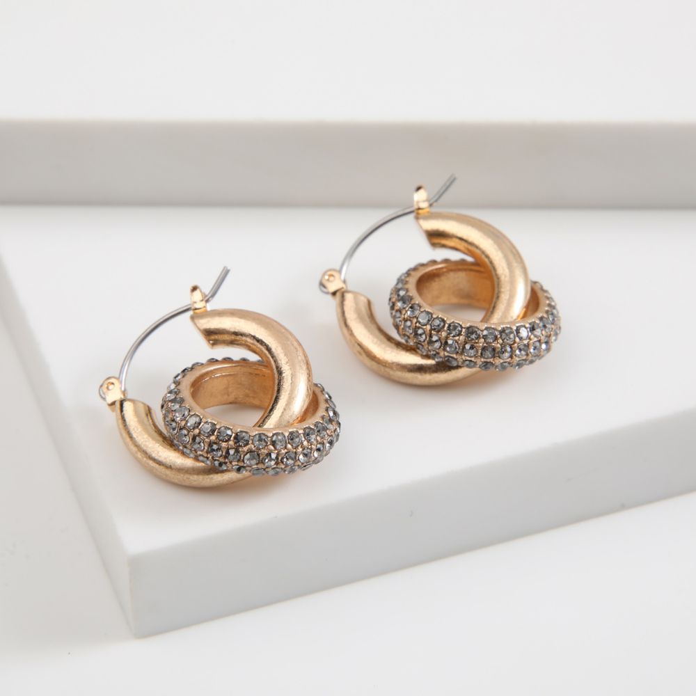 Aros tipo argollas dobles doradas. Una argolla es lisa y la otra tiene brillantes color negro de fantasía.