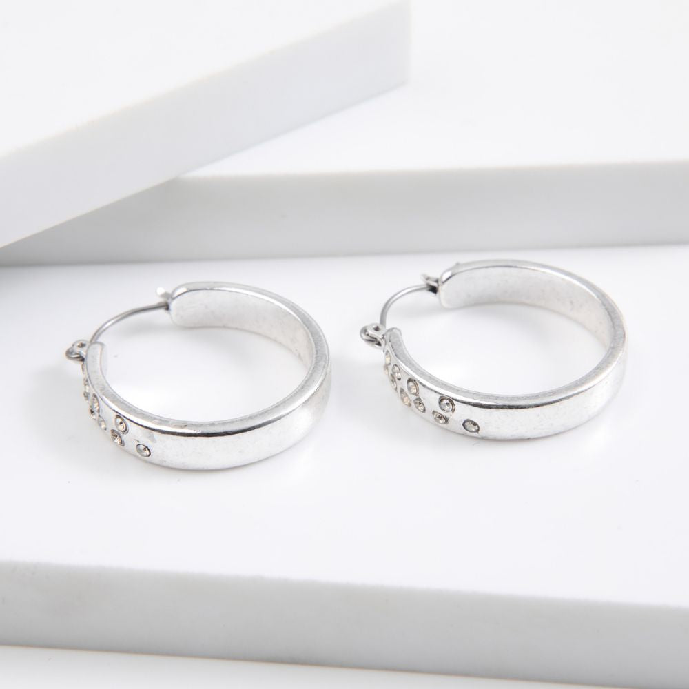 Aros tipo argolla gruesa plateada con brillantes de fantasía.