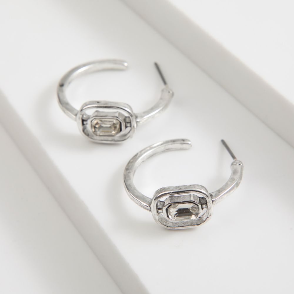 Argollas medianas gruesas en metal plateado con rectángulo y brillante de fantasía blanco incrustado por el frente