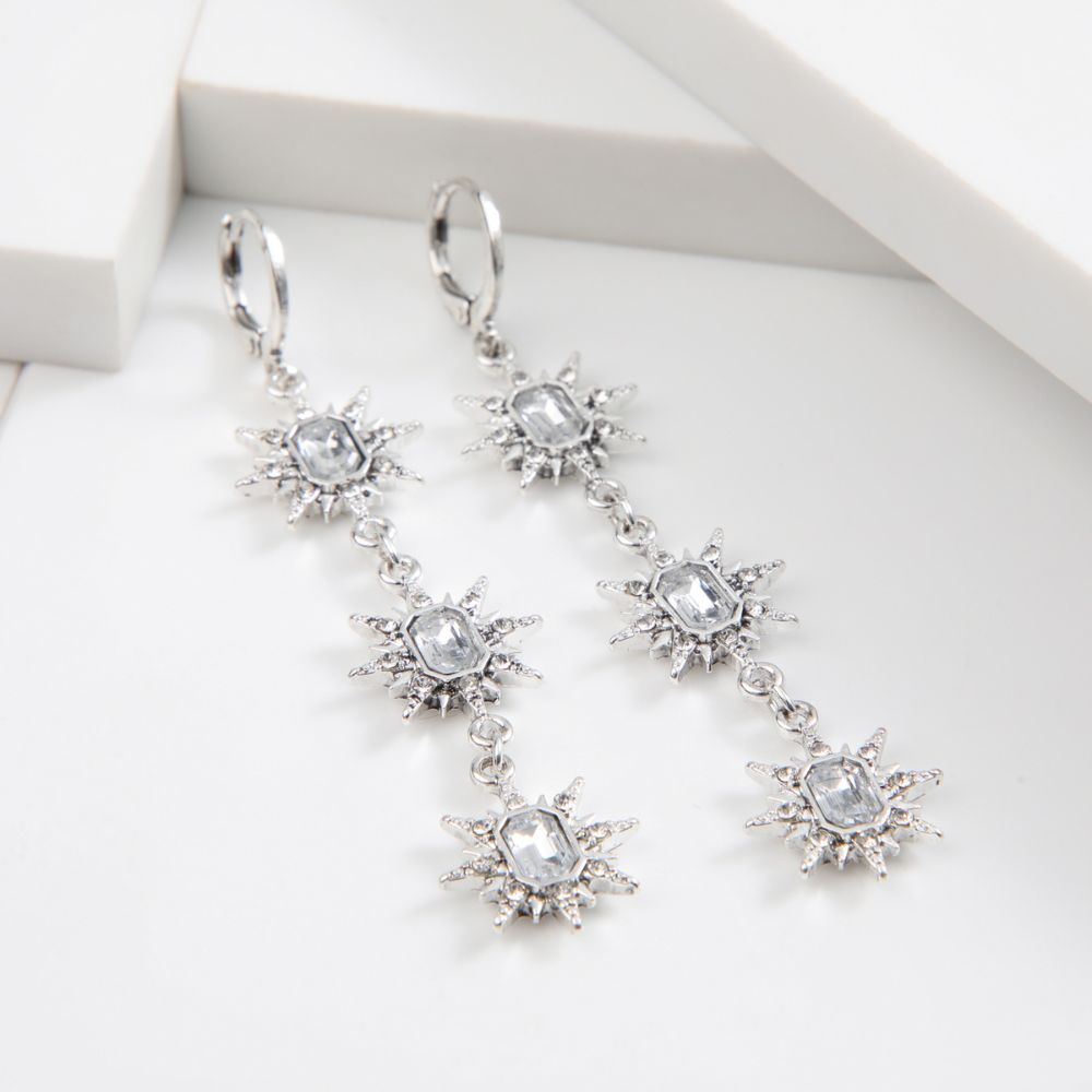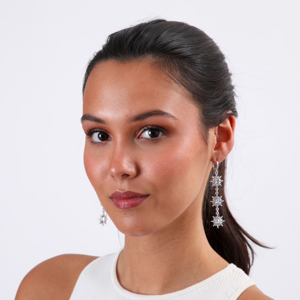 Aros tipo argolla con cadena de dijes de sol con brillantes blancos de fantasía.