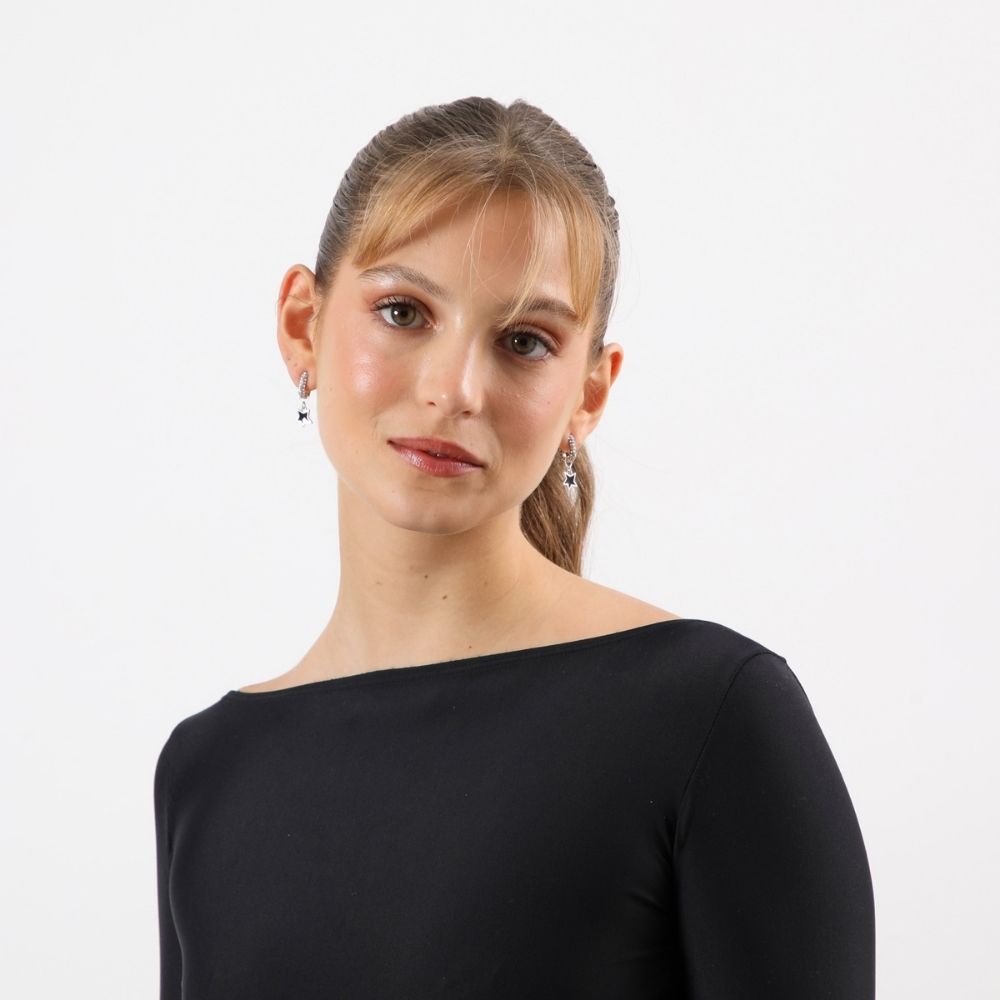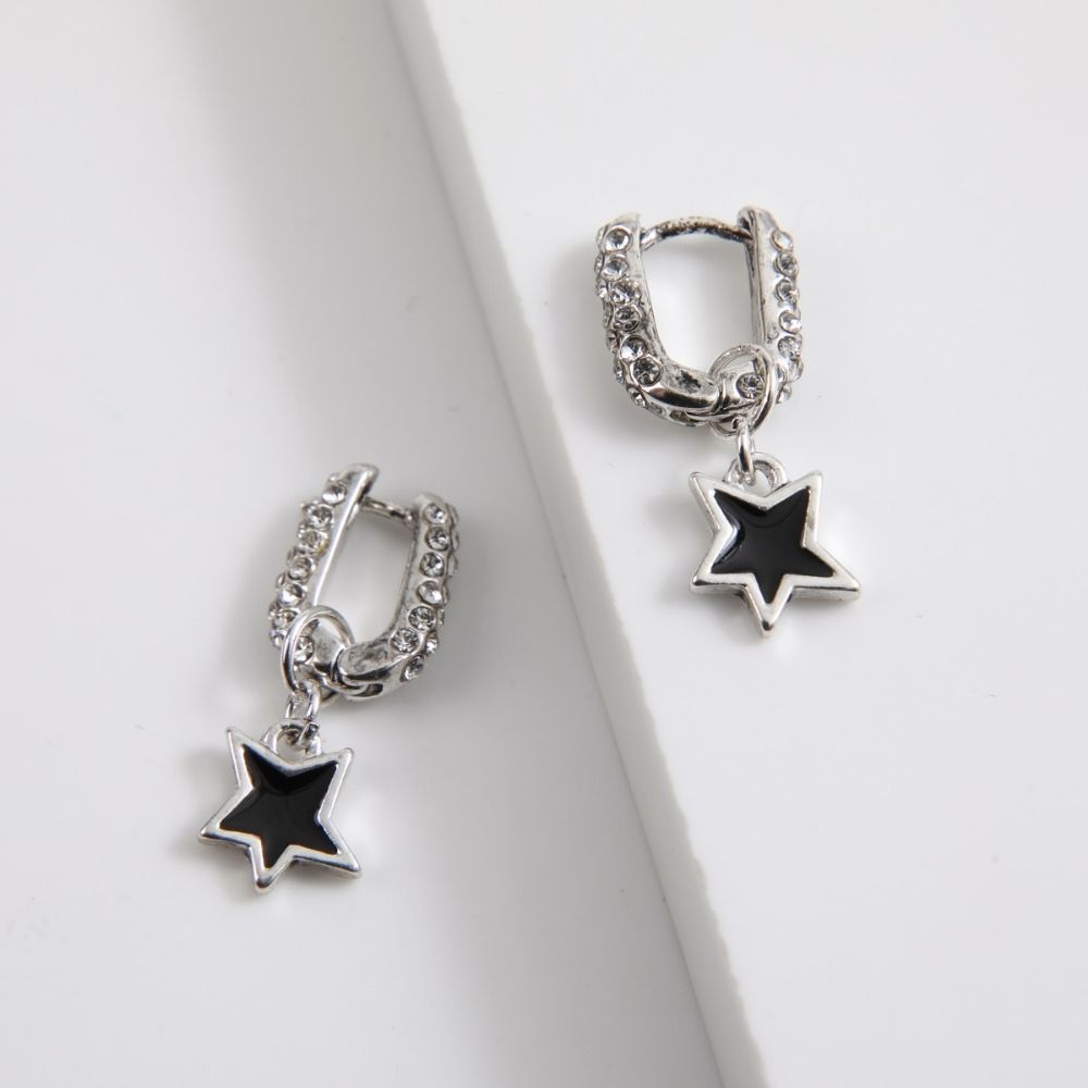 Aros Tipo Argolla Color Plateado Con Brillantes De Fantasía Y Un Dije De Estrella Color Gris.