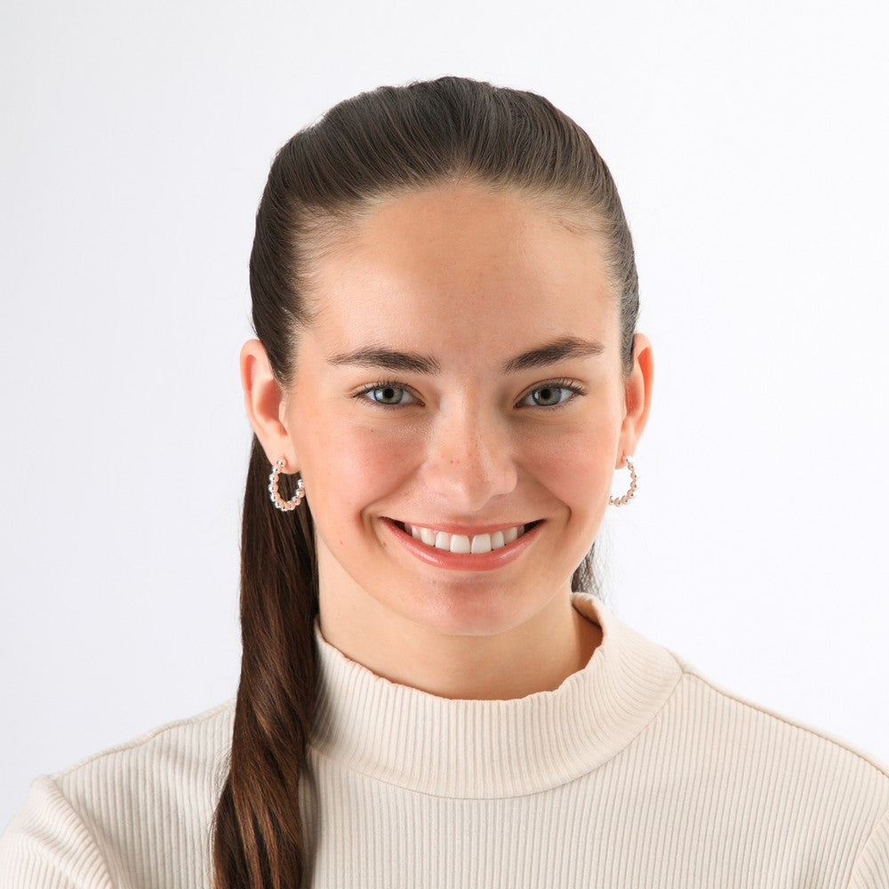 Aros tipo argolla abierta plateado, formados por una secuencia de pequeñas esferas lisas y brillantes. Un diseño minimalista y moderno para uso diario.