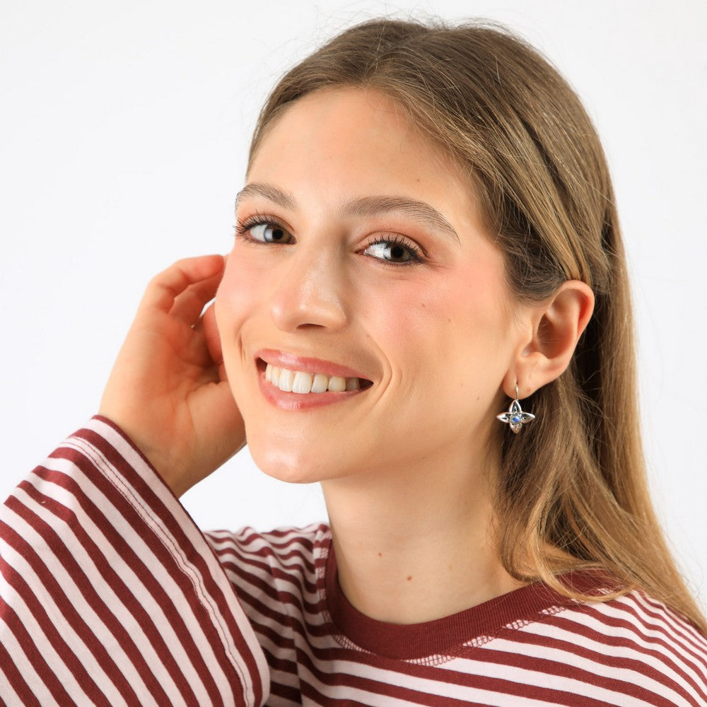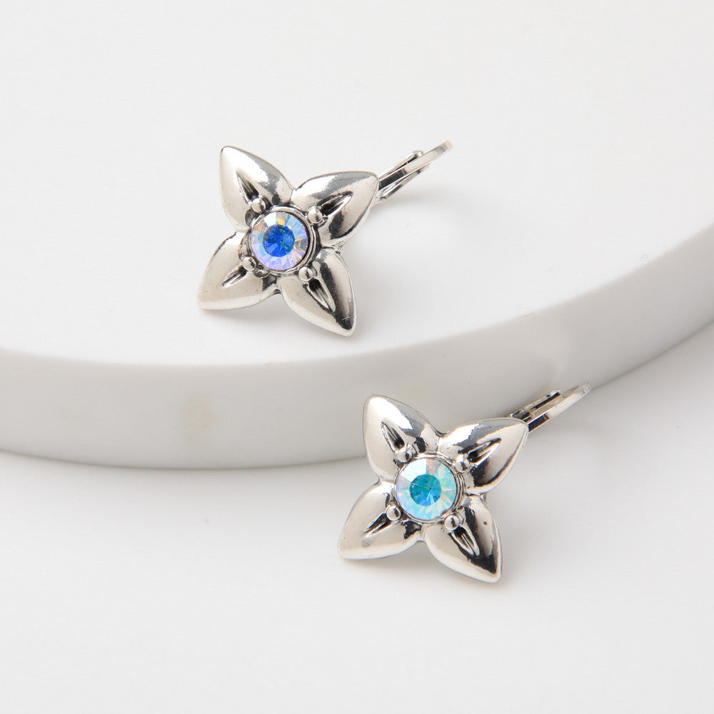 Aros pequeños plateados, con forma de flor de cuatro pétalos y un brillo tornasol al centro. Un diseño delicado y femenino para uso diario.