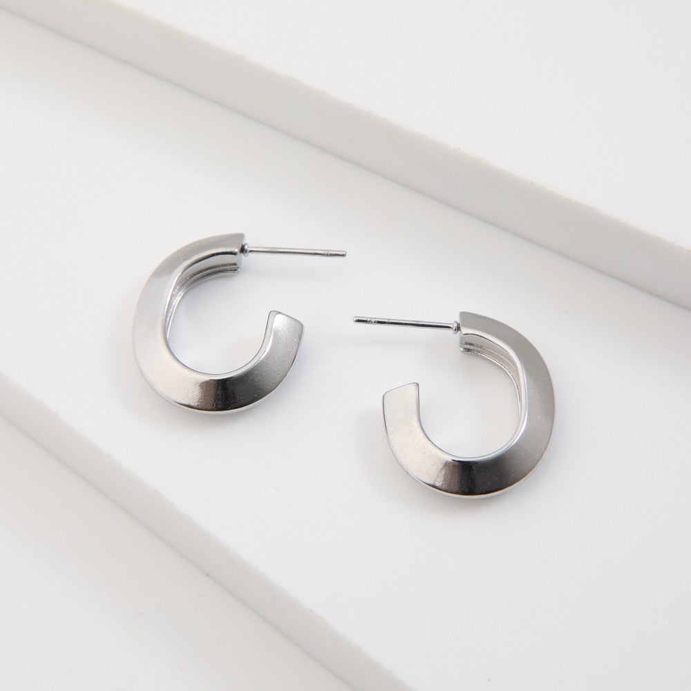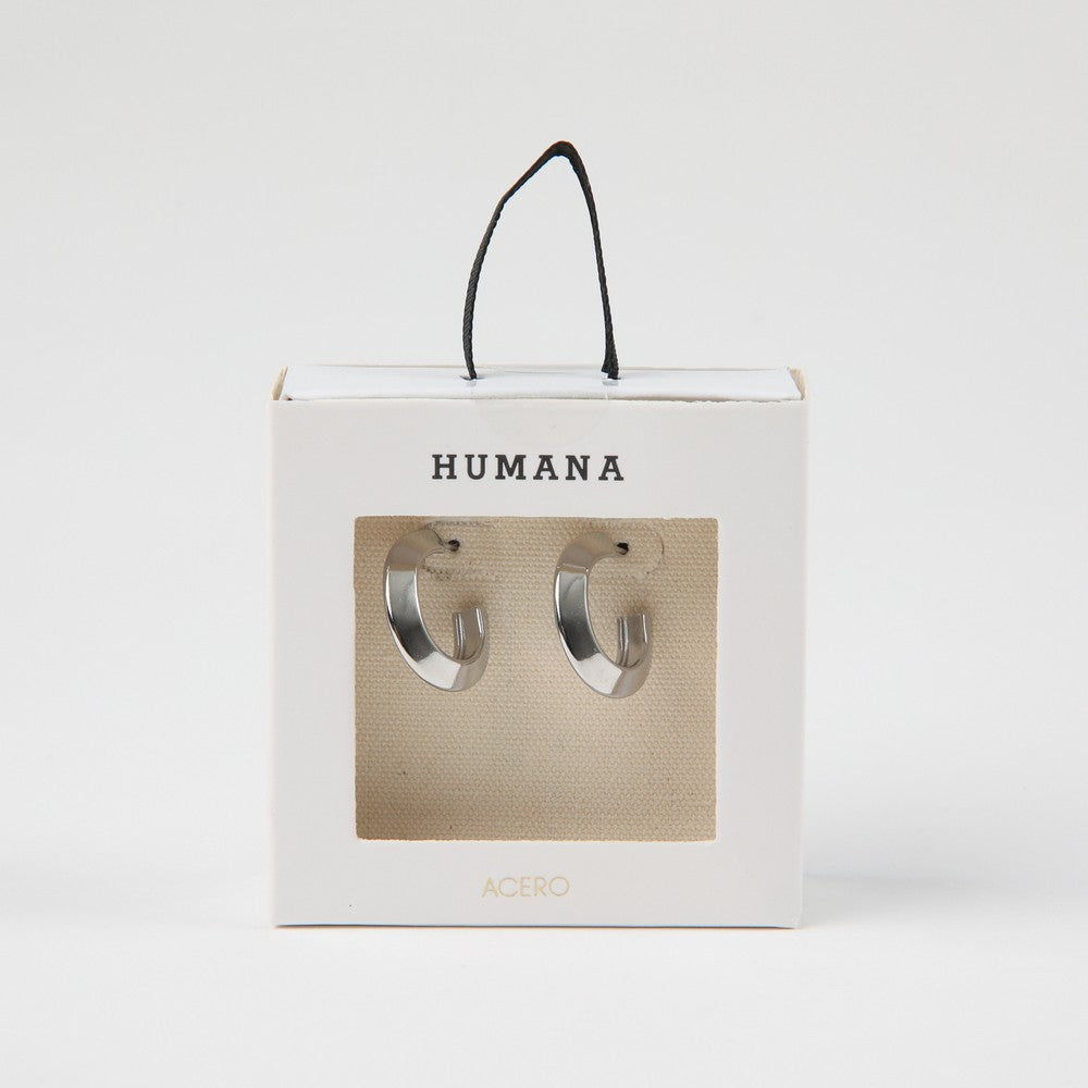 Argollas de acero color plateado, con diseño liso y terminación brillante. Presentan sistema de cierre con tope. Un accesorio práctico para el día a día.