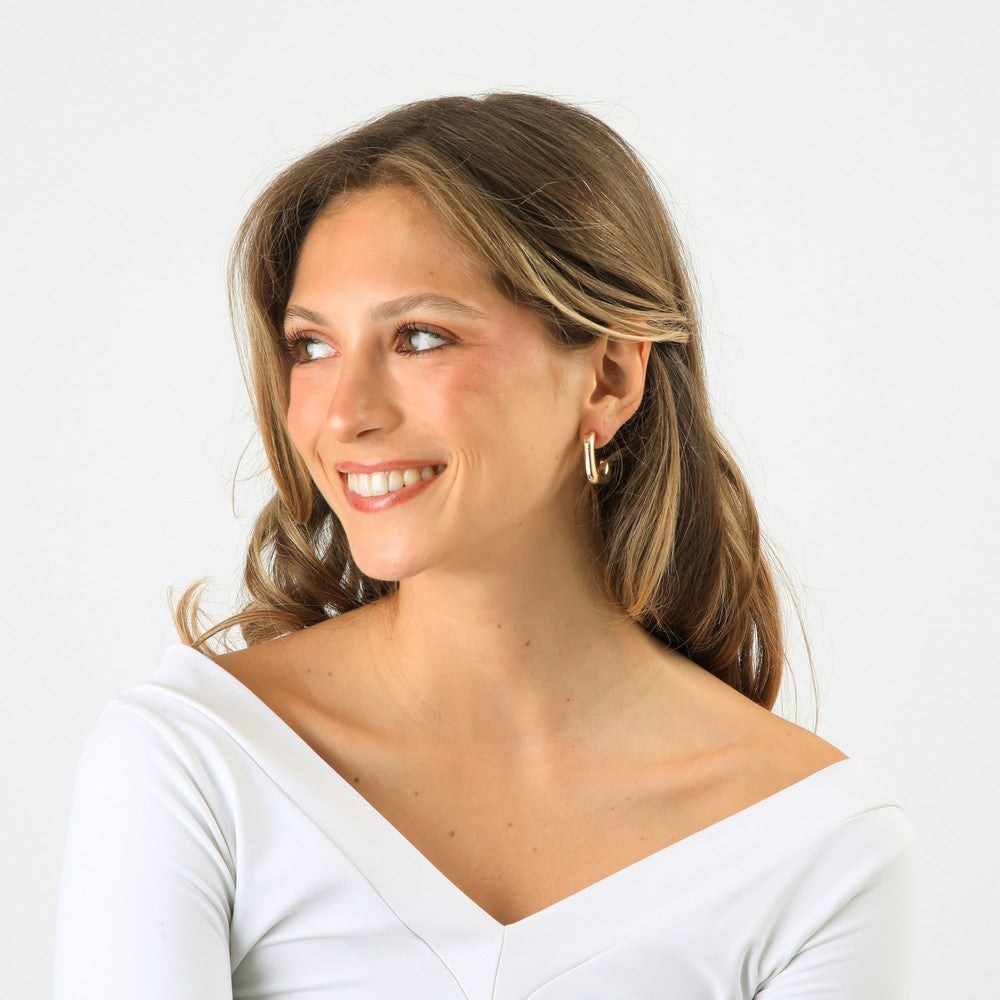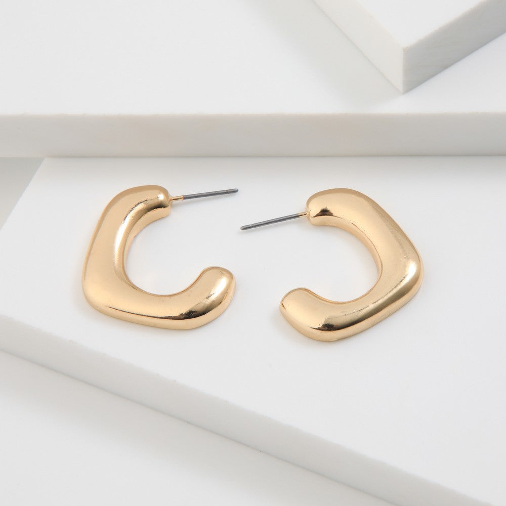 Aros en tono dorado con acabado brillante. Presentan diseño curvo tipo argolla abierta, de líneas suaves y volumen marcado que aporta un look moderno y elegante. Su tamaño medio los hace ideales para uso diario, sumando presencia sin sobrecargar. Un accesorio práctico y fácil de combinar, pensado para complementar distintos estilos.