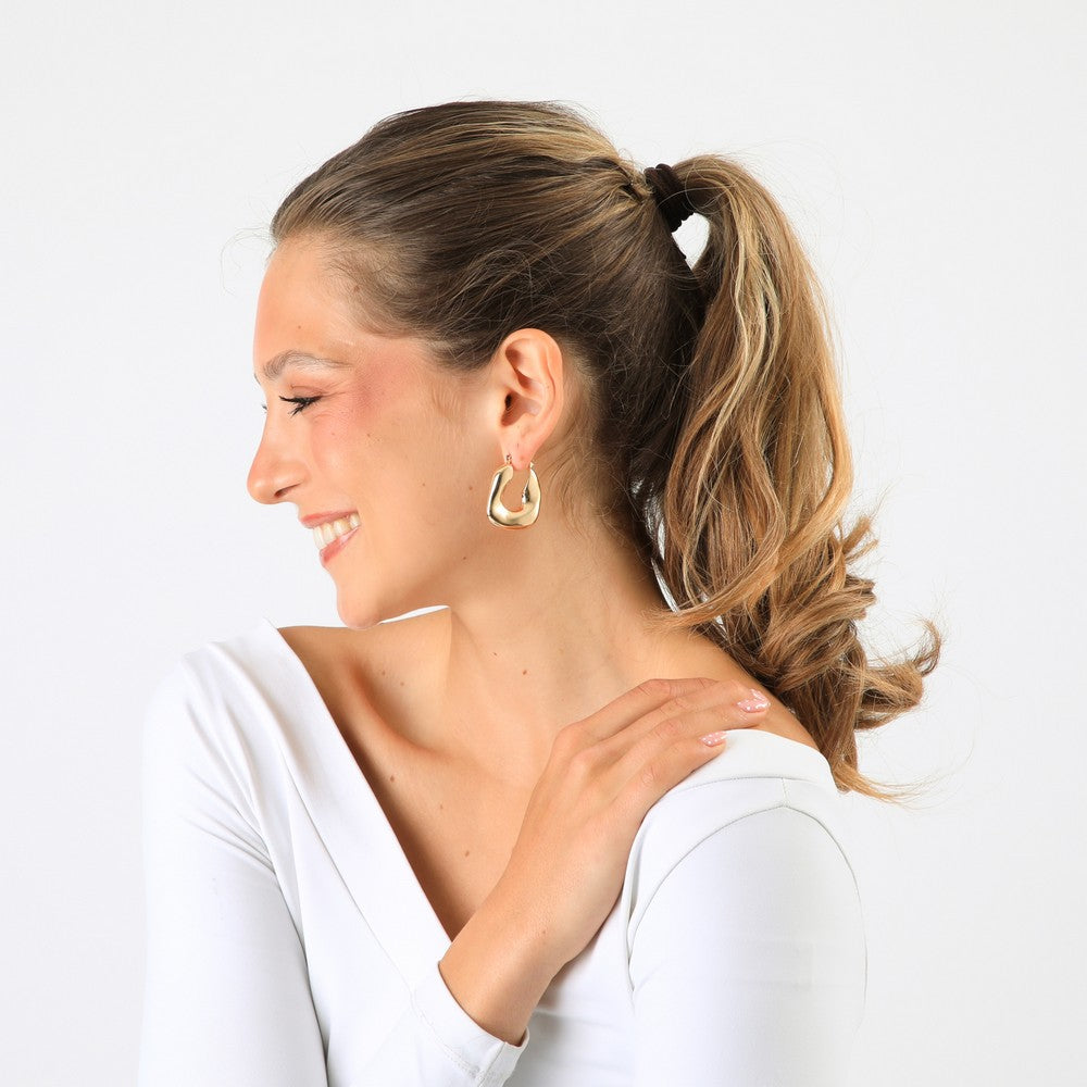 Aros con diseño tipo argolla cerrada, de forma orgánica y volumen marcado, que aporta un look moderno y elegante. Su tamaño medio los hace ideales para usar a diario, sumando presencia sin recargar el outfit. Un accesorio práctico y fácil de combinar, con un diseño moderno y funcional.
