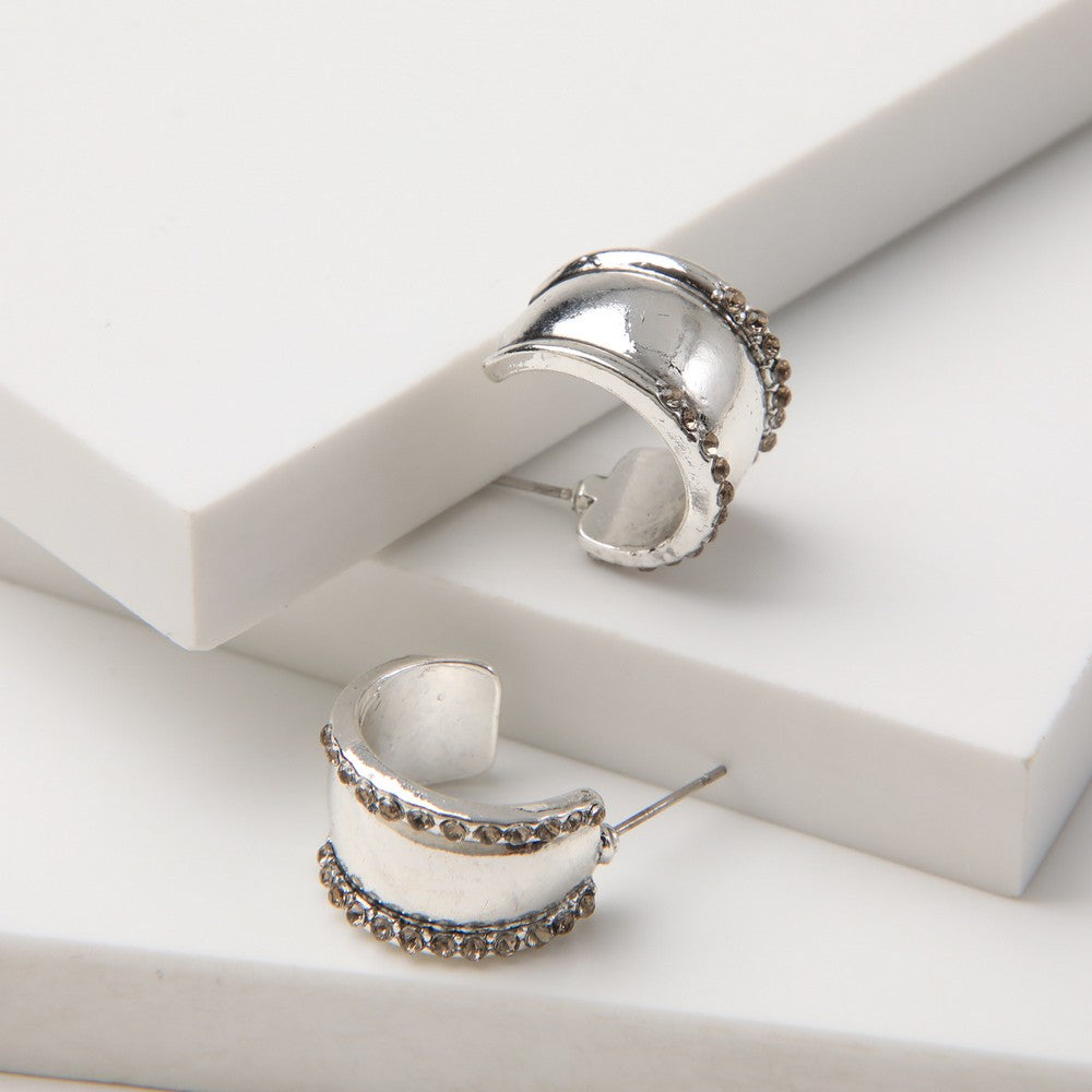 Aros argollas en plateado, con ambos bordes decorado con brillos. Un diseño moderno y versátil para darle un toque especial al look diario.