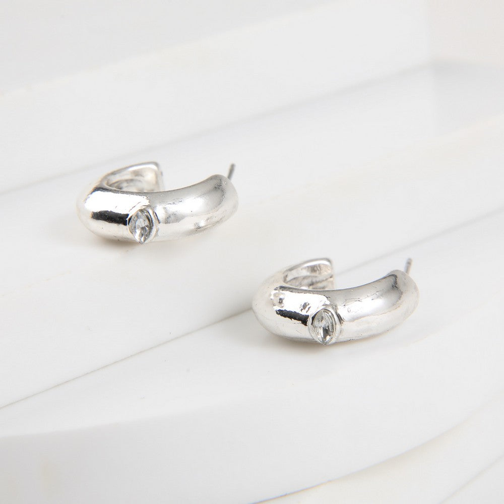 Aros tipo argolla en tono plateado, de forma robusta y acabado pulido que aporta un look moderno y versátil. En la parte frontal incorporan un pequeño detalle tipo cristal, que suma un toque sutil de brillo sin perder la simpleza del diseño. Su tamaño compacto los hace perfectos para usar a diario o para complementar outfits de invierno donde destacan sobre prendas abrigadas y de tonos neutros. Un esencial minimalista con un guiño elegante.