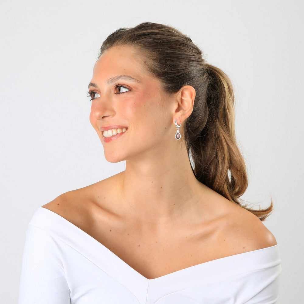 Argollas en tono plateado con cristales al frente que aportan brillo sutil. Incluyen un colgante en forma de gota con cristal facetado en tono gris oscuro, montado en bisel plateado. Un diseño elegante y versátil, ideal para elevar looks de día o complementar outfits más formales.