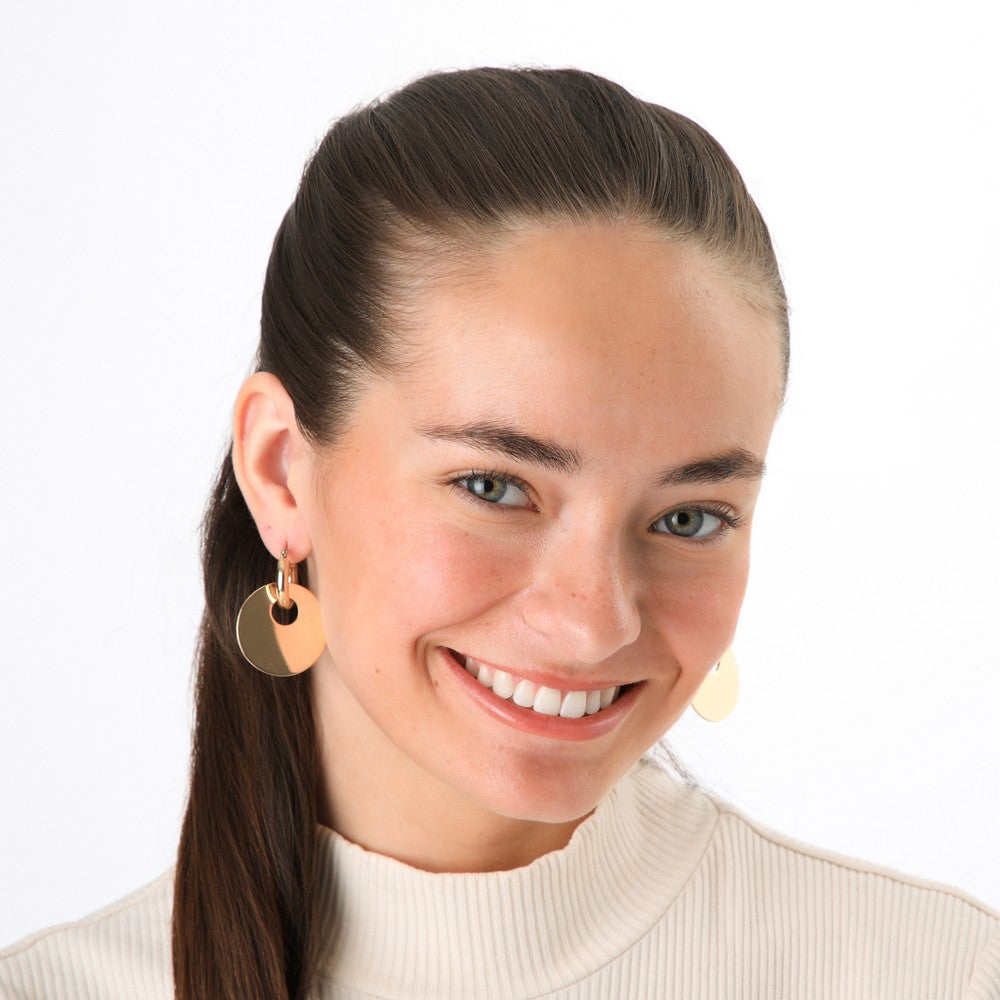 Aros dorados con argolla curva y dije redondo liso, de acabado brillante y look minimalista. Un accesorio elegante y versátil para elevar cualquier outfit.
