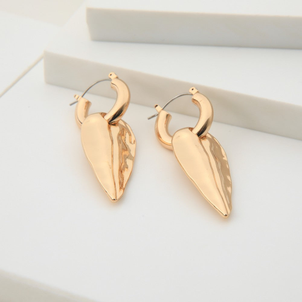 Aros colgantes de color dorado con diseño y acabado brillante. Presentan argolla superior lisa con cierre de gancho y pieza colgante en forma de gota estilizada y pulida. Ideales para un look elegante.