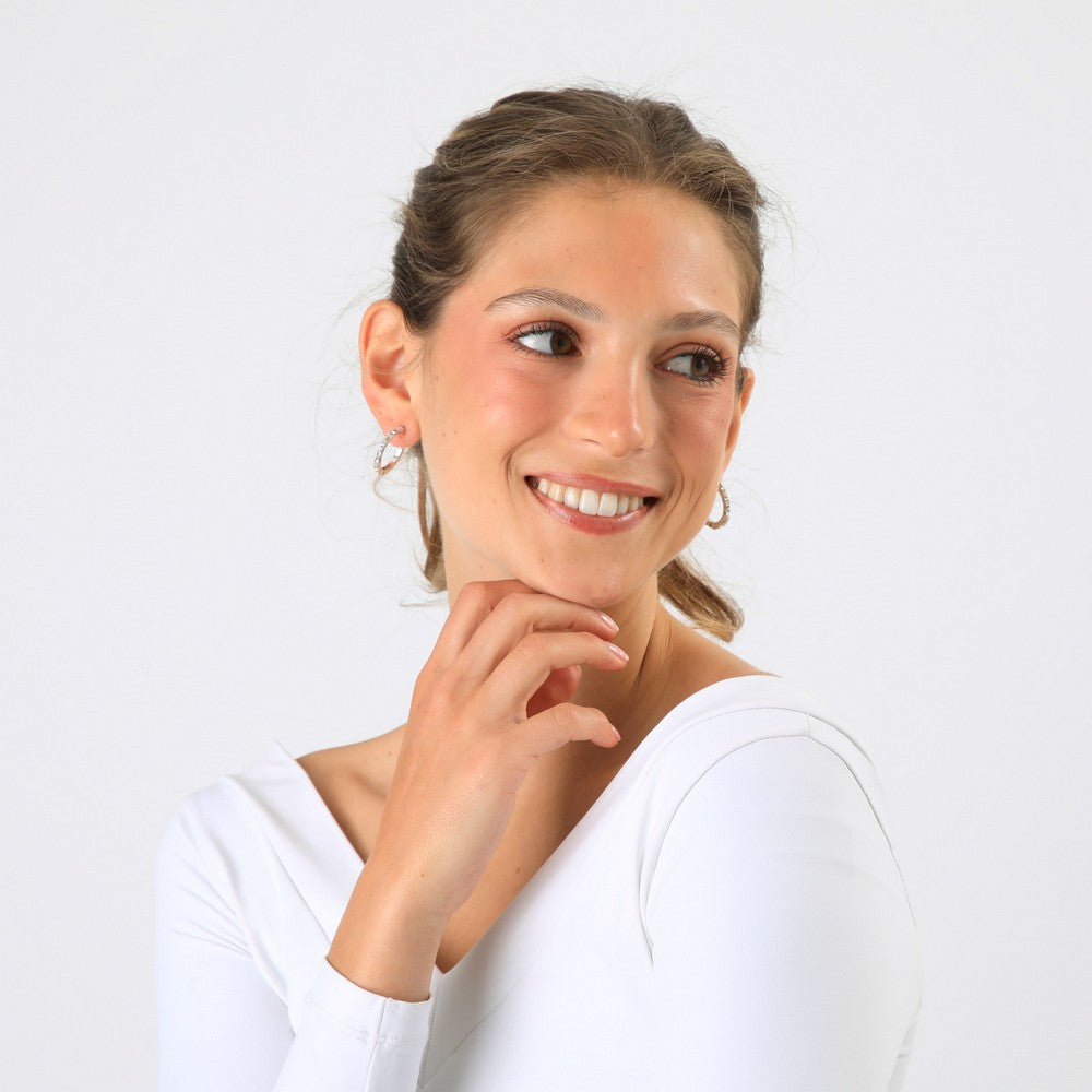 Argollas plateadas con tipo cristales facetados, dispuestos de forma continua que aportan brillo y textura. Presentan un diseño compacto y elegante, ideal para usar a diario o para sumar un toque luminoso a looks más formales.