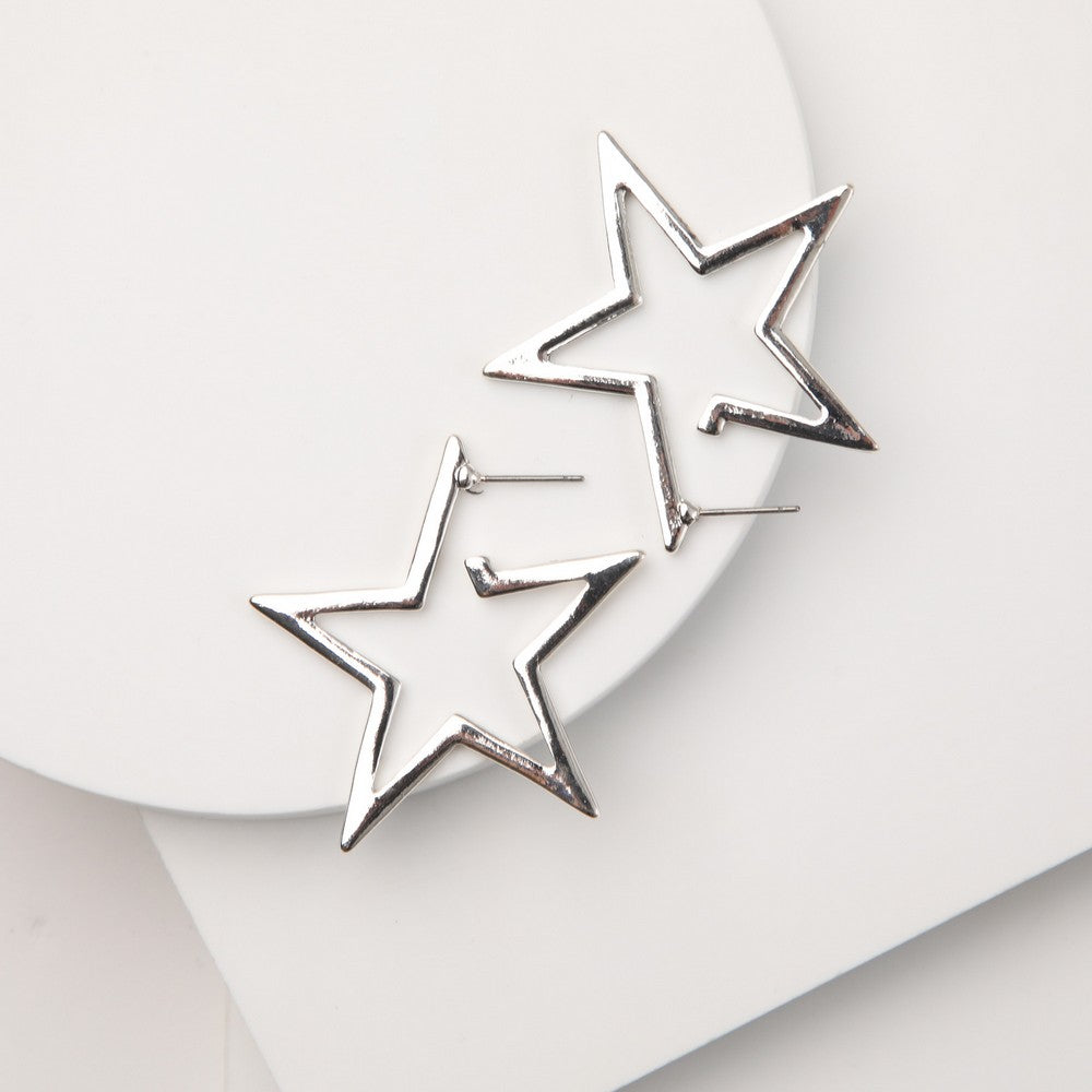 Argollas en tono plateado con diseño de estrella de líneas abiertas. Su forma aporta un estilo moderno y llamativo, ideal para quienes buscan un accesorio protagonista. Un diseño actual y versátil que eleva cualquier look, perfecto para usar tanto de día como de noche.