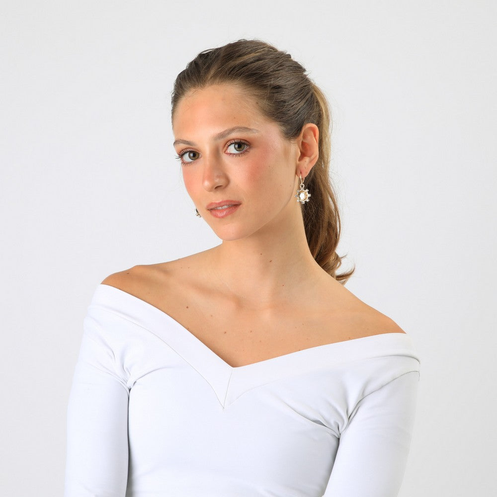 Aros dorados con argolla y un colgante en forma de sol, protagonizado por una pieza central tipo cristal en tono champagne. Alrededor, pequeños destellos tipo cristal transparentes aportan luminosidad y un acabado elegante. Un accesorio ideal para levantar looks de invierno con un toque cálido y brillante.