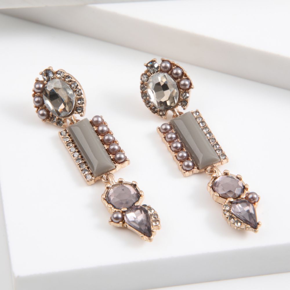 Aros largos pegados con dijes compuestos de piedras y brillantes de fantasía en tonos grises.