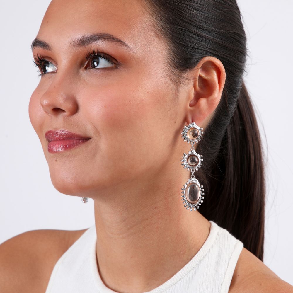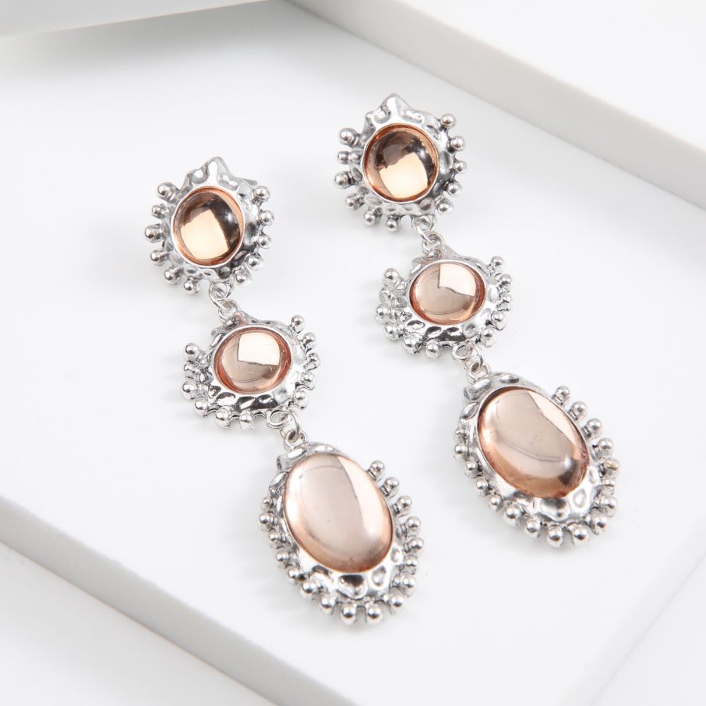 Aros largos pegados plateado con dijes circulares con piedras naranjas de fantasía.