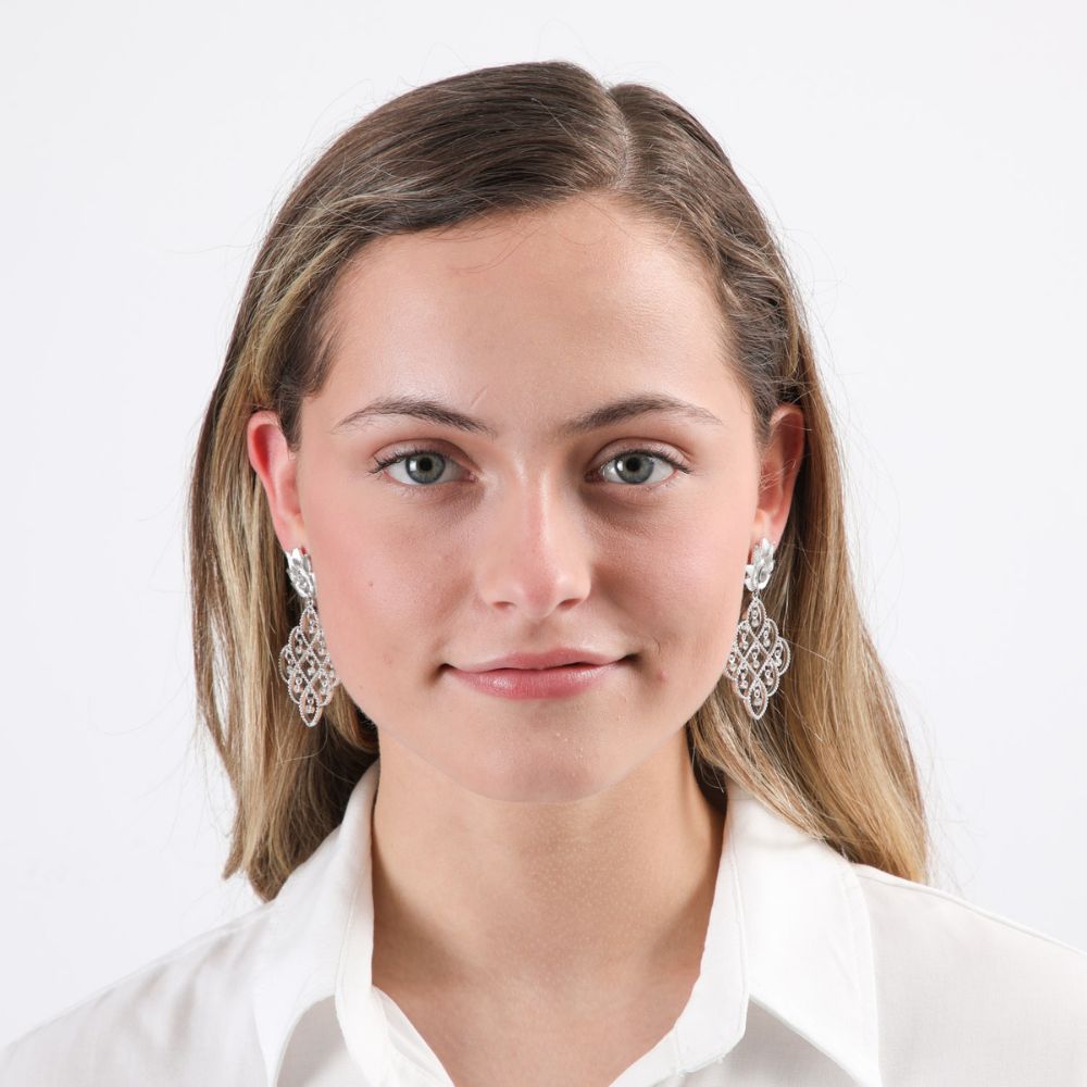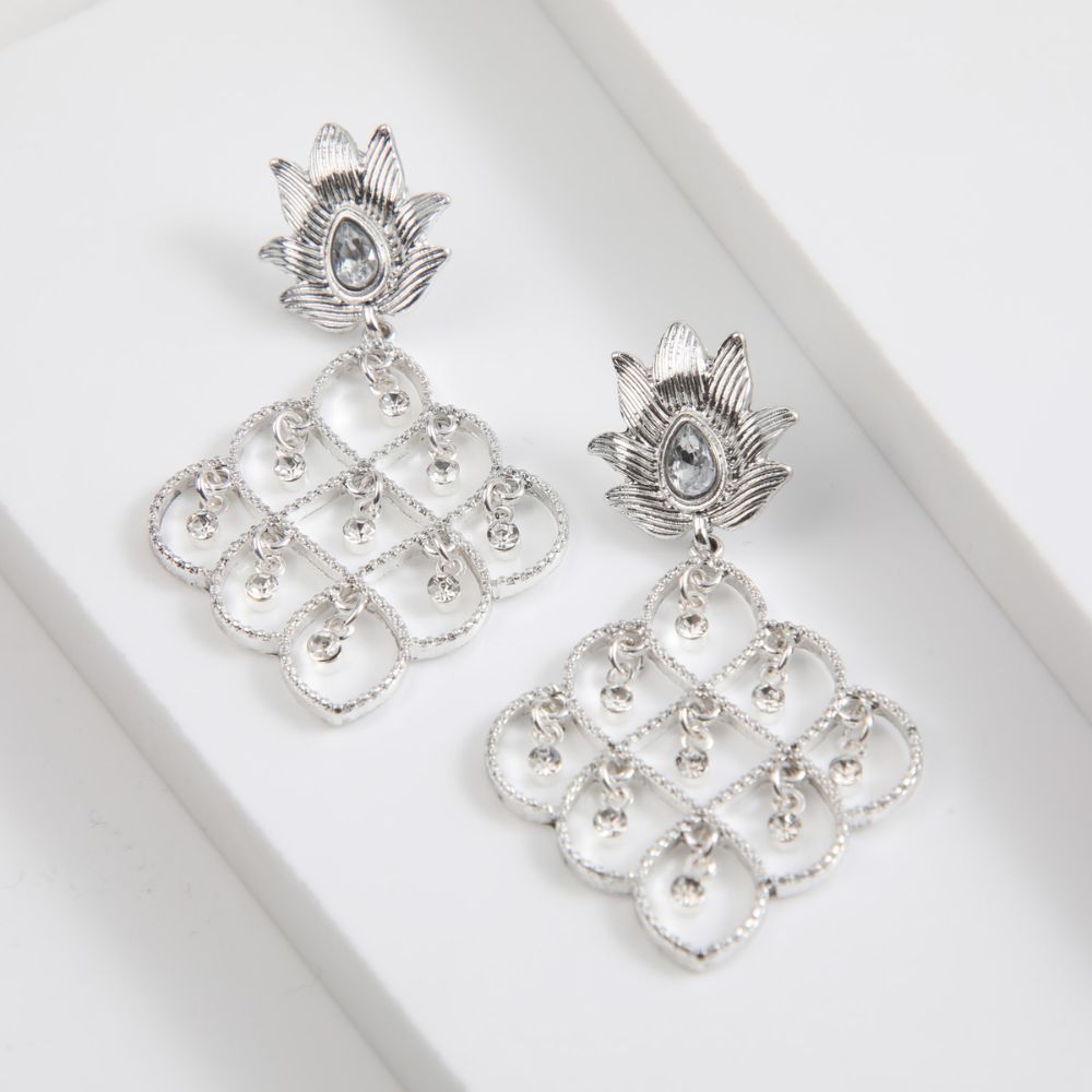 Aros largos en metal plateado. Consta de figra tipo flor con brillante de fantasía blanco, seguida por red de 9 espacios en posición de rombo curvo con brillantes de fantasía blancos pequeños colgando en cada espacio.