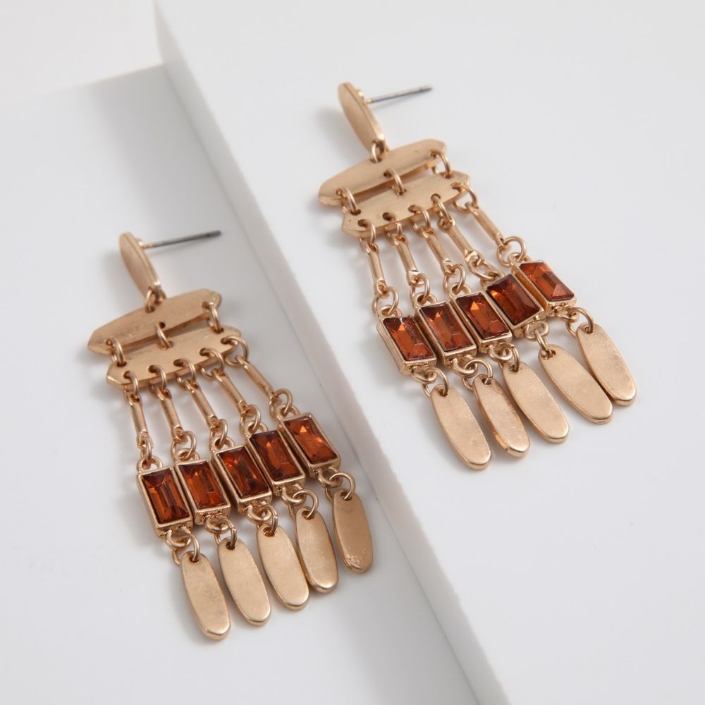 Aros Dorados Largos Con Piedras Naranjas De Fantasía.