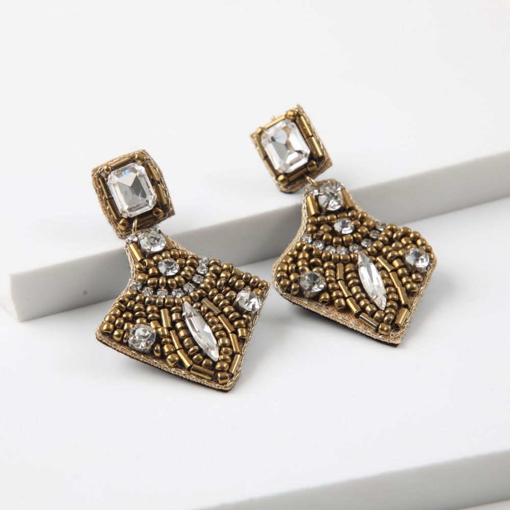 Aro Largo Doble De Piedras De Fantasía Y Mostacillas Doradas.