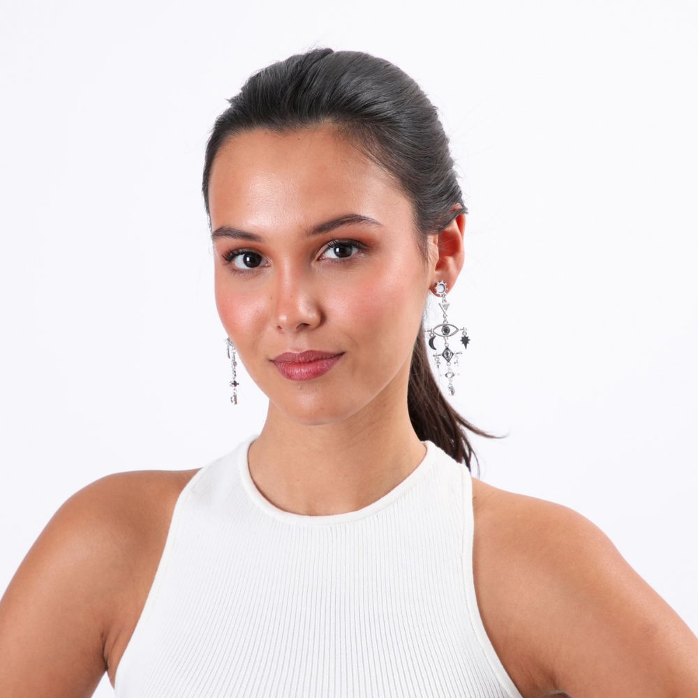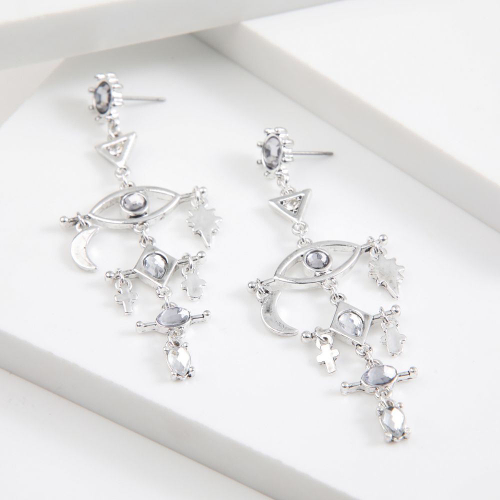 Aros largos pegados con dijes de ojos, lunas, entre otras cosas y piedras de fantasía color blanco.