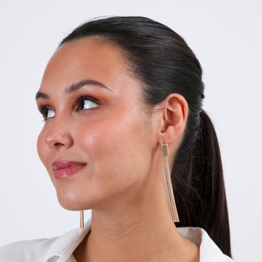 Aro largo en metal dorado compuesto por un rectángulo grueso pequeño con varias cadenas tubulares colgando.