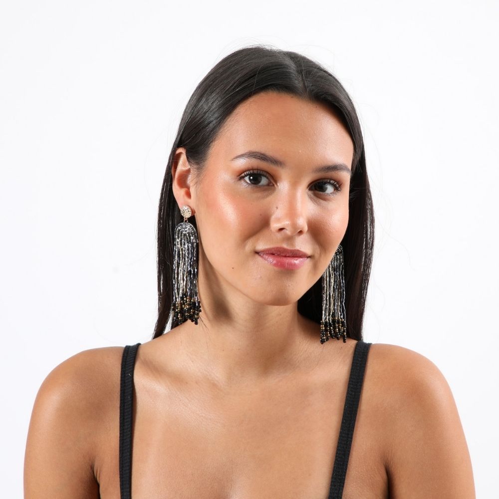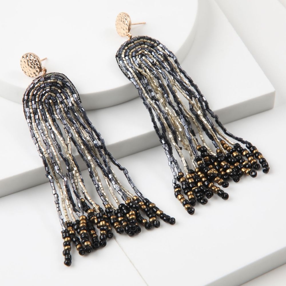 Aro Largo De Base Redonda Metálica Dorada Texturada, Con Flecos De Mostacillas Color Dorado Y Azul.