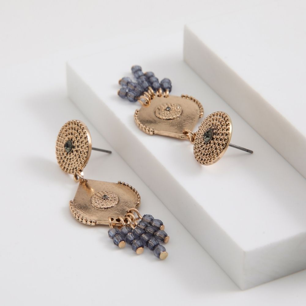 Aros Dorados Largos Circualres Con Piedra Azul De Fantasía Y Dije Con Mostacillas Azules.