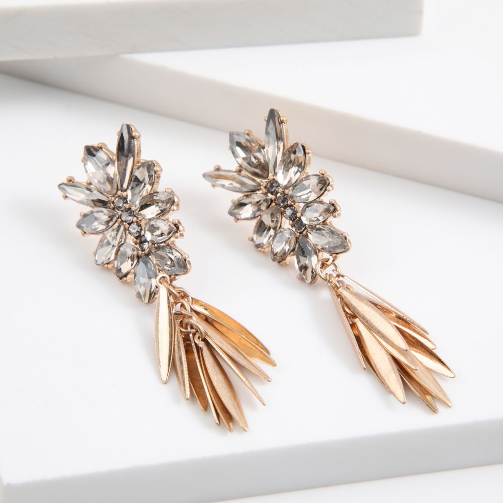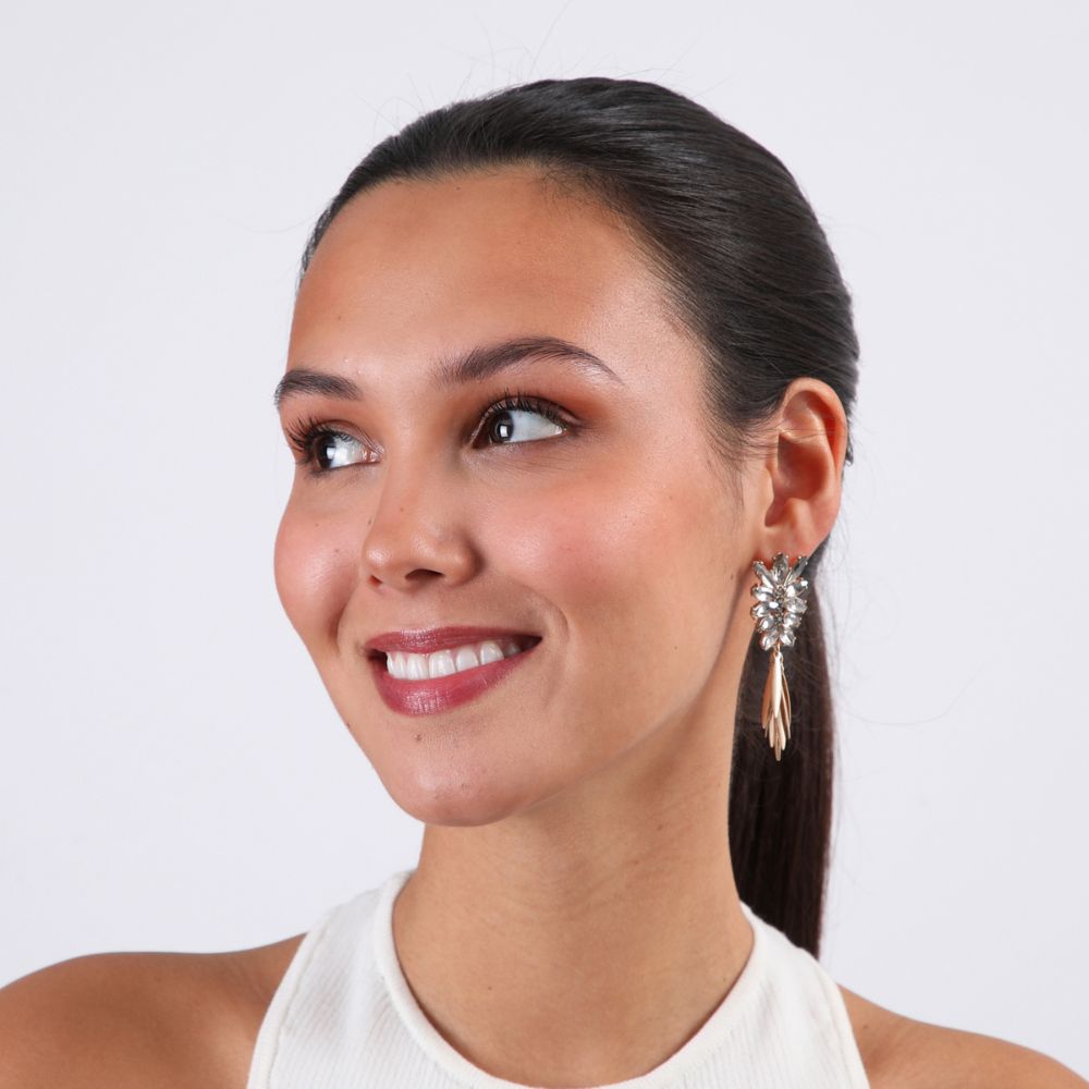 Aros largos pegados con forma de flor y brillantes de fantasía color gris. Tiene hojas doradas que caen.