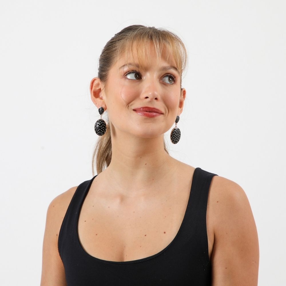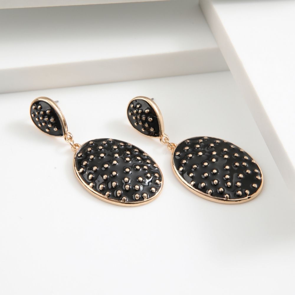 Aro Largo De Gota Invertida De Terminación Negra Con Puntos Dorados Y Dije.