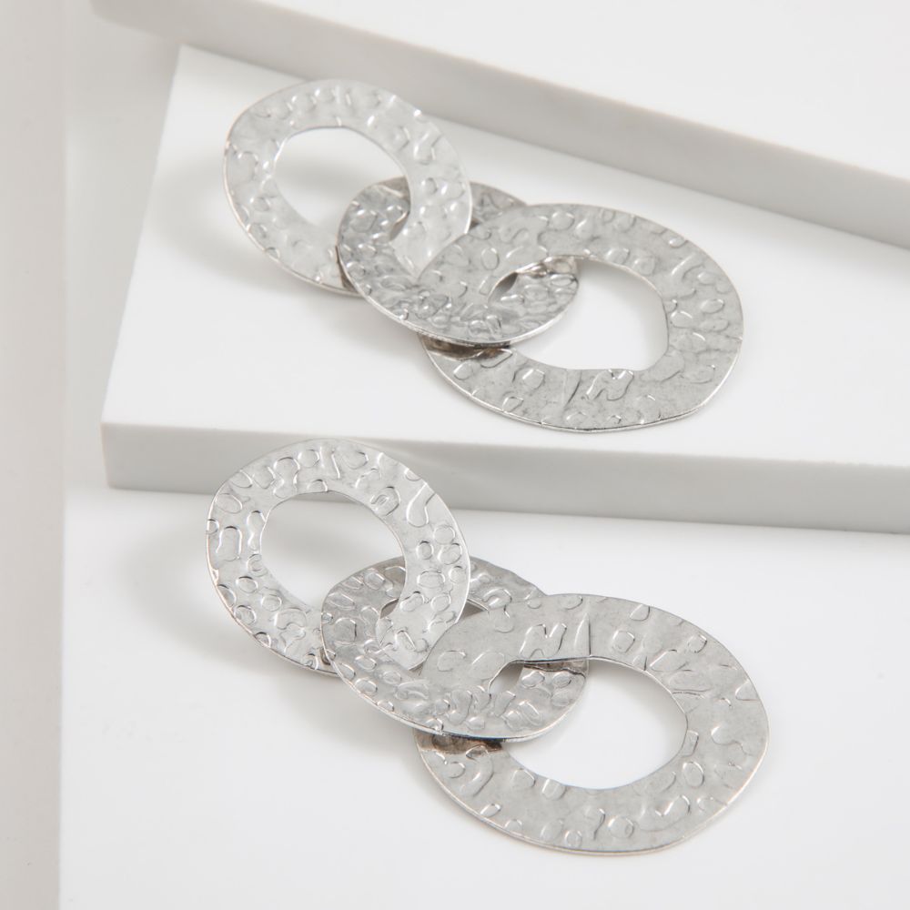 Aros largos plateados con 3 argollas gruesas entrelazadas.