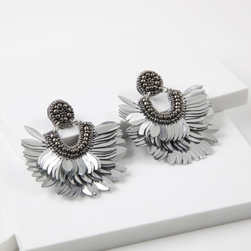 Aro Colgante De Base Redonda Con Conjunto De Mostacillas Plateadas Y Lentejuelas En Forma De Hojas.