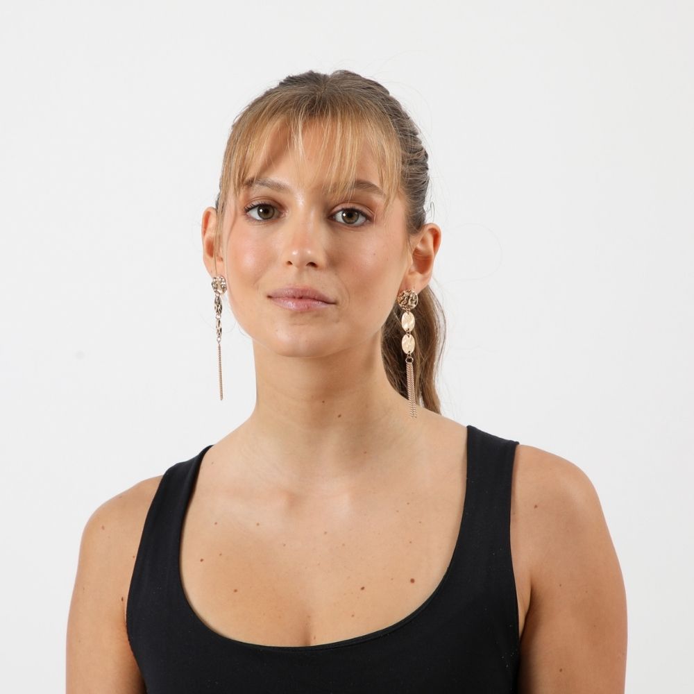 Aros Largos De Piezas Doradas Texturadas Y Flecos De Cadena Delgada.