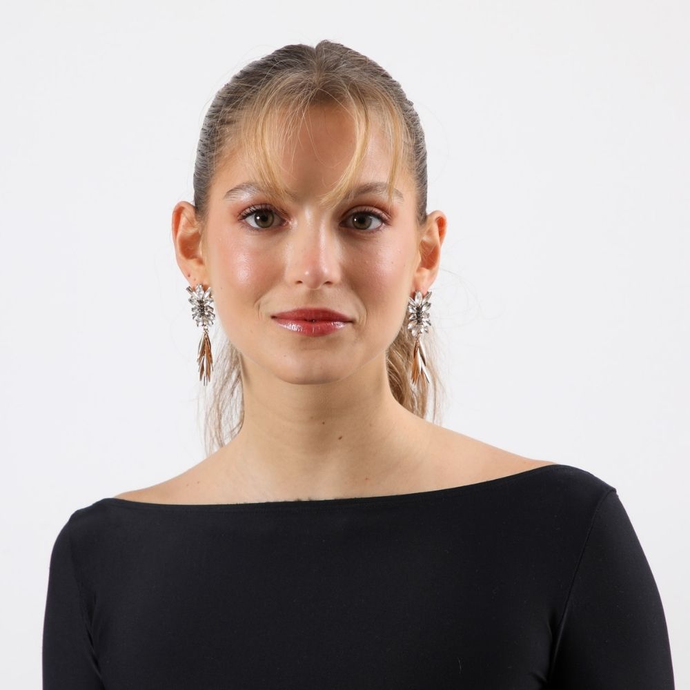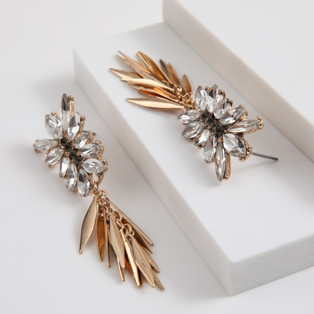 Aros Largos Dorados Con Piedras De Fantasía Transparentes Y Verdes Y Hojas Lisas Que Caen.