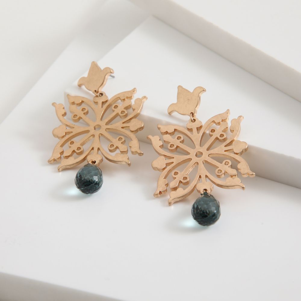 Aros largos pegados con forma de flor y gran dije en forma de mandala que termina con una gota verde de piedra de fantasía.