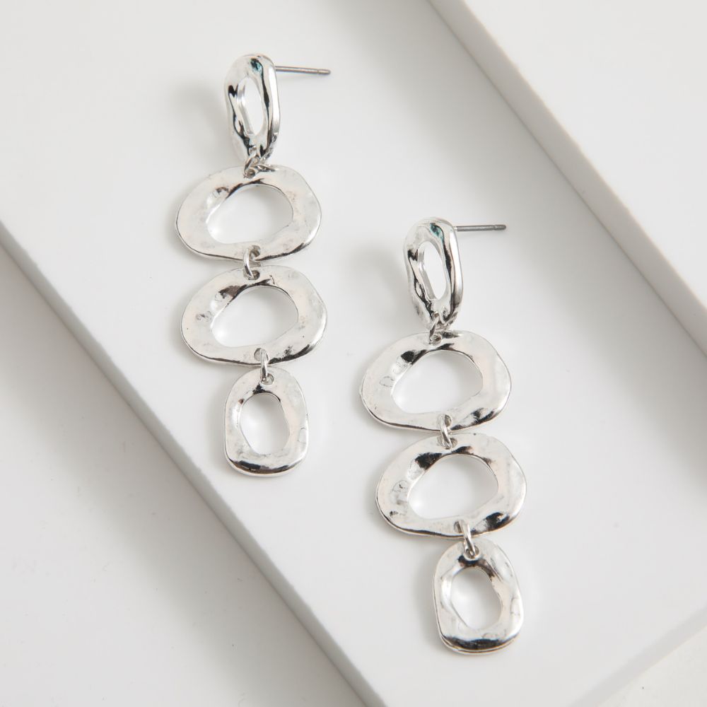 Aros largos en metal plateado. Consta de cadena compuesta por cuatro circunferencias ovaladas, anchas, irregulares y de distintos tamaños.