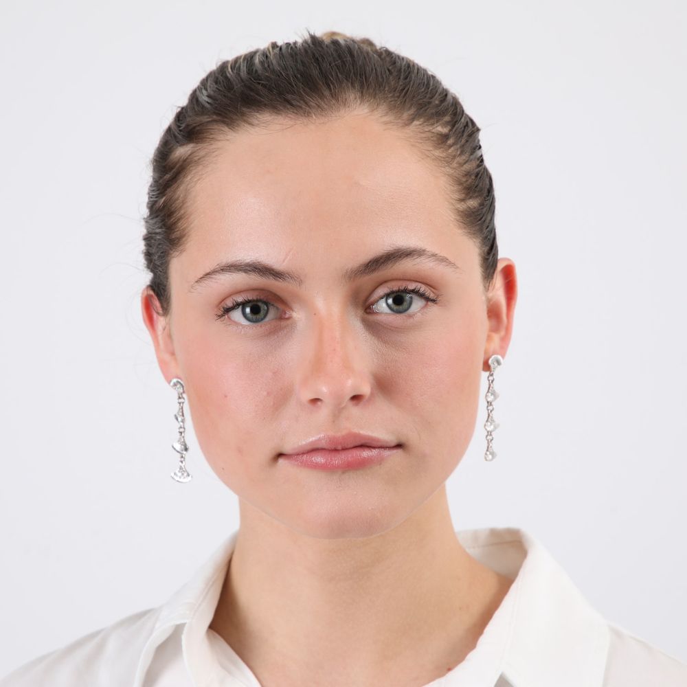 Aros largos en metal plateado. Consta de cadena compuesta por cuatro abanicos pequeños y curvos con textura de líneas y brillantes de fantasía blancos.
