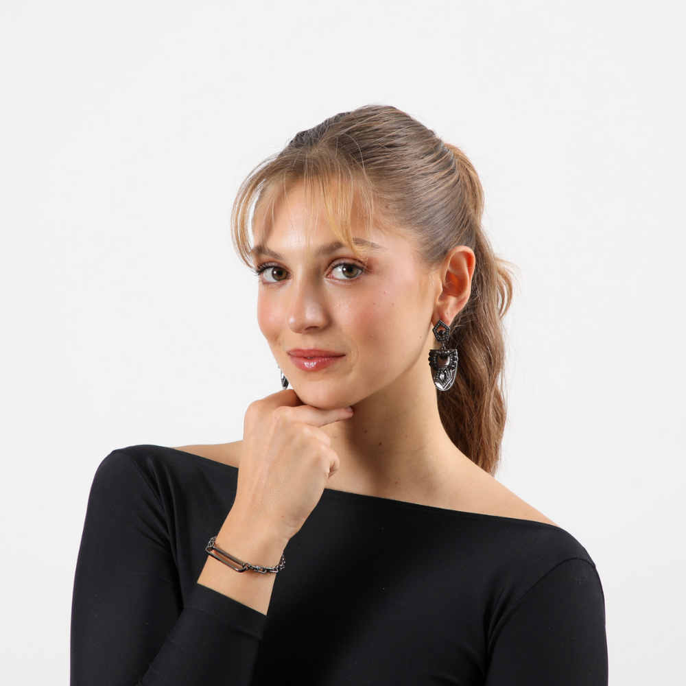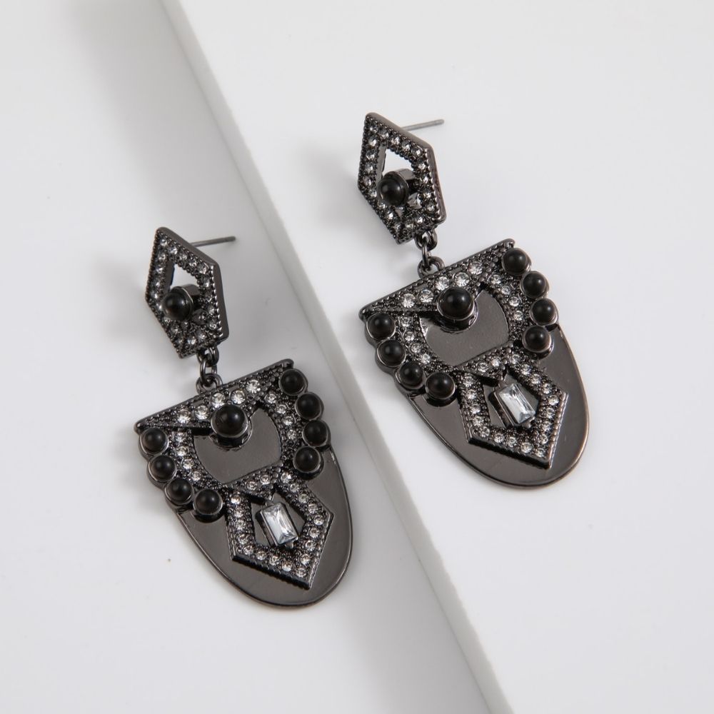 Aros Largos Color Plateado Oscuro Con Brillantes De Fantasía Y Piedras Grises De Fantasía.