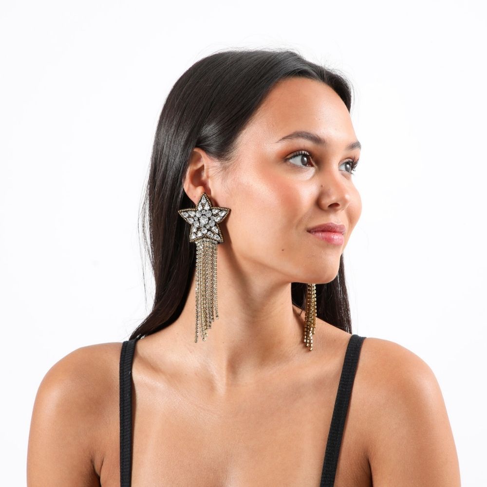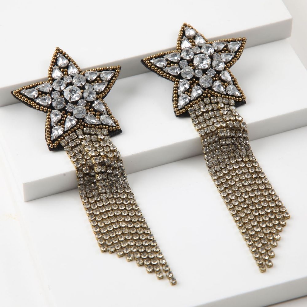 Aro Pegado En Forma De Estrella Con Piedras De Fantasía Y Mostacillas Doradas, Con Flecos De Piedras De Fantasía.