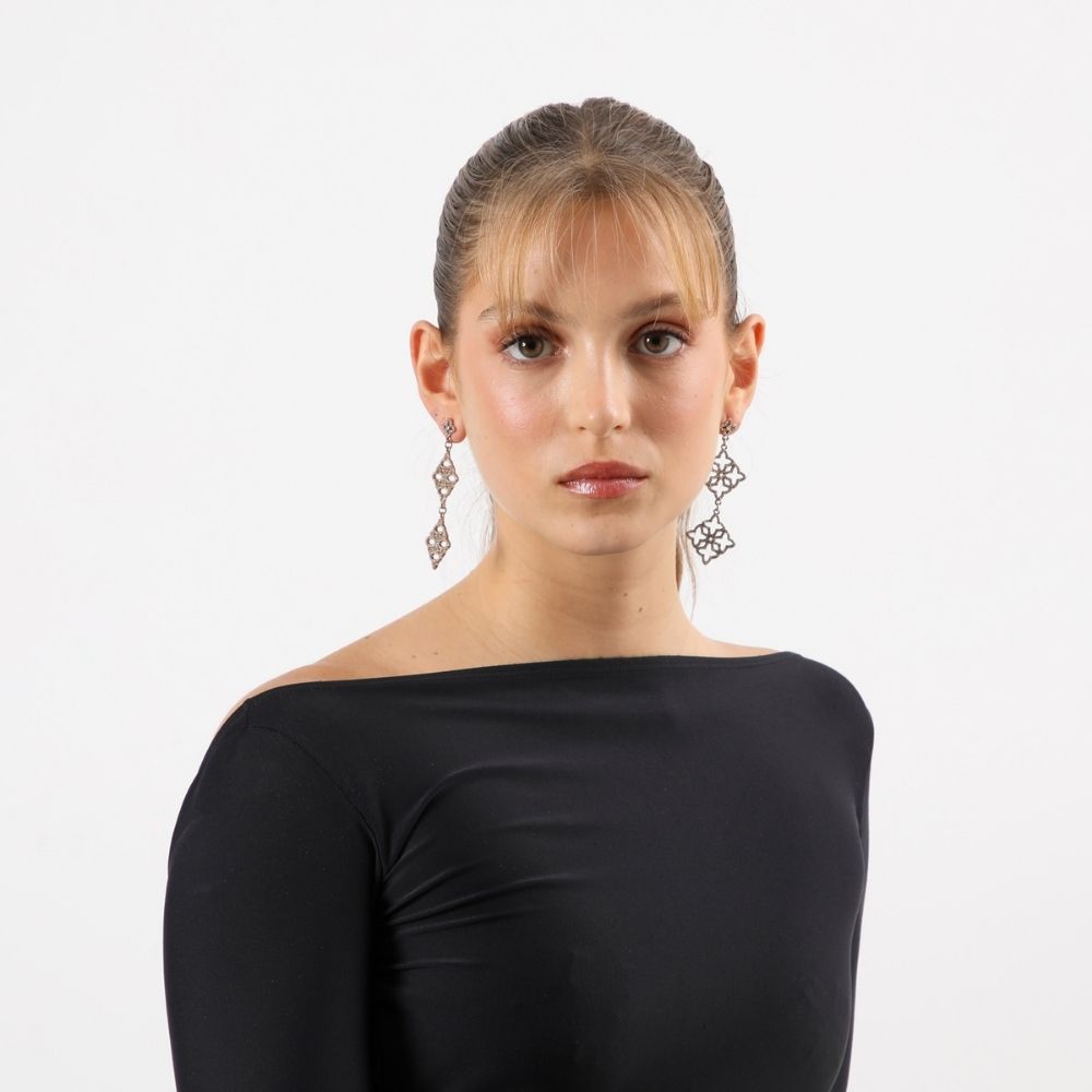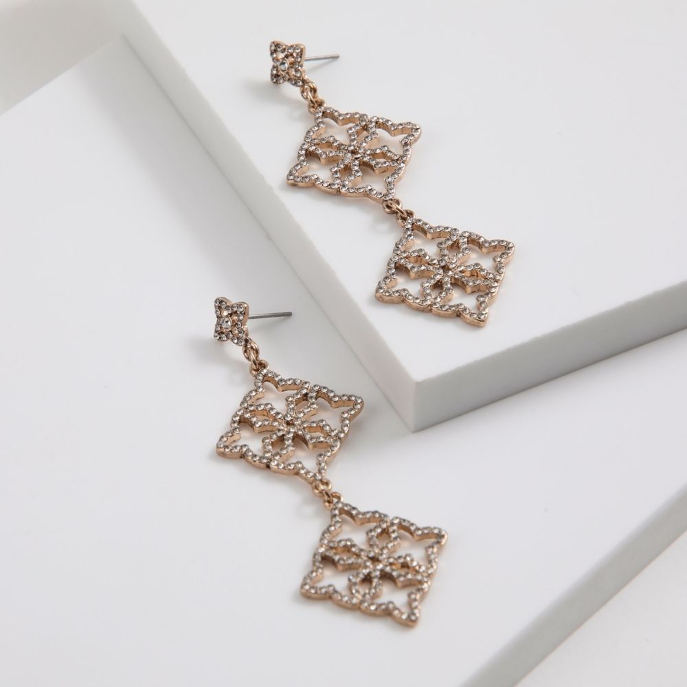 Aros Largos Dorados Con Tres Dijes Con Pequeños Brillantes De Fantasía.