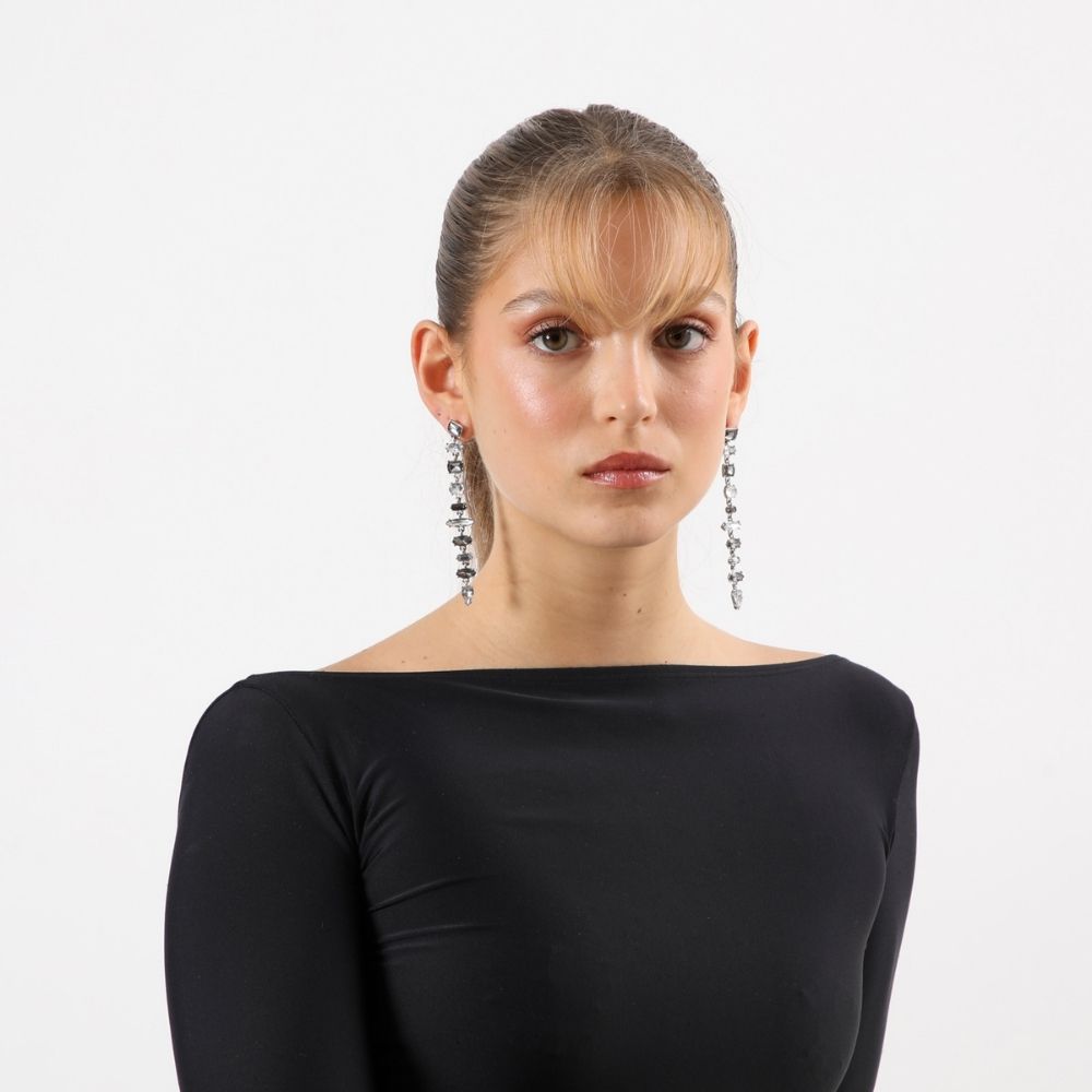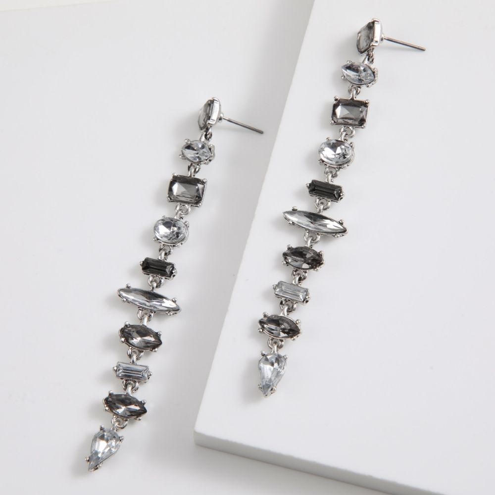 Aros Largos Plateados Con 10 Piedras De Fantasía En Tonos Grises.