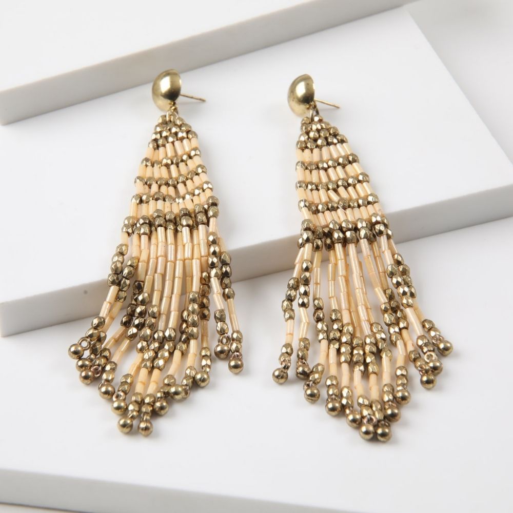 Aro Colgante De Base Redonda Con Conjunto De Mostacillas En Tono Dorado Y Hilos De Mostacillas Color Beige.