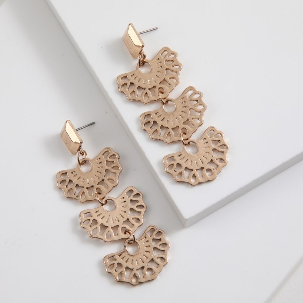 Aros Largos Dorados Con Tres Dijes De Flores.