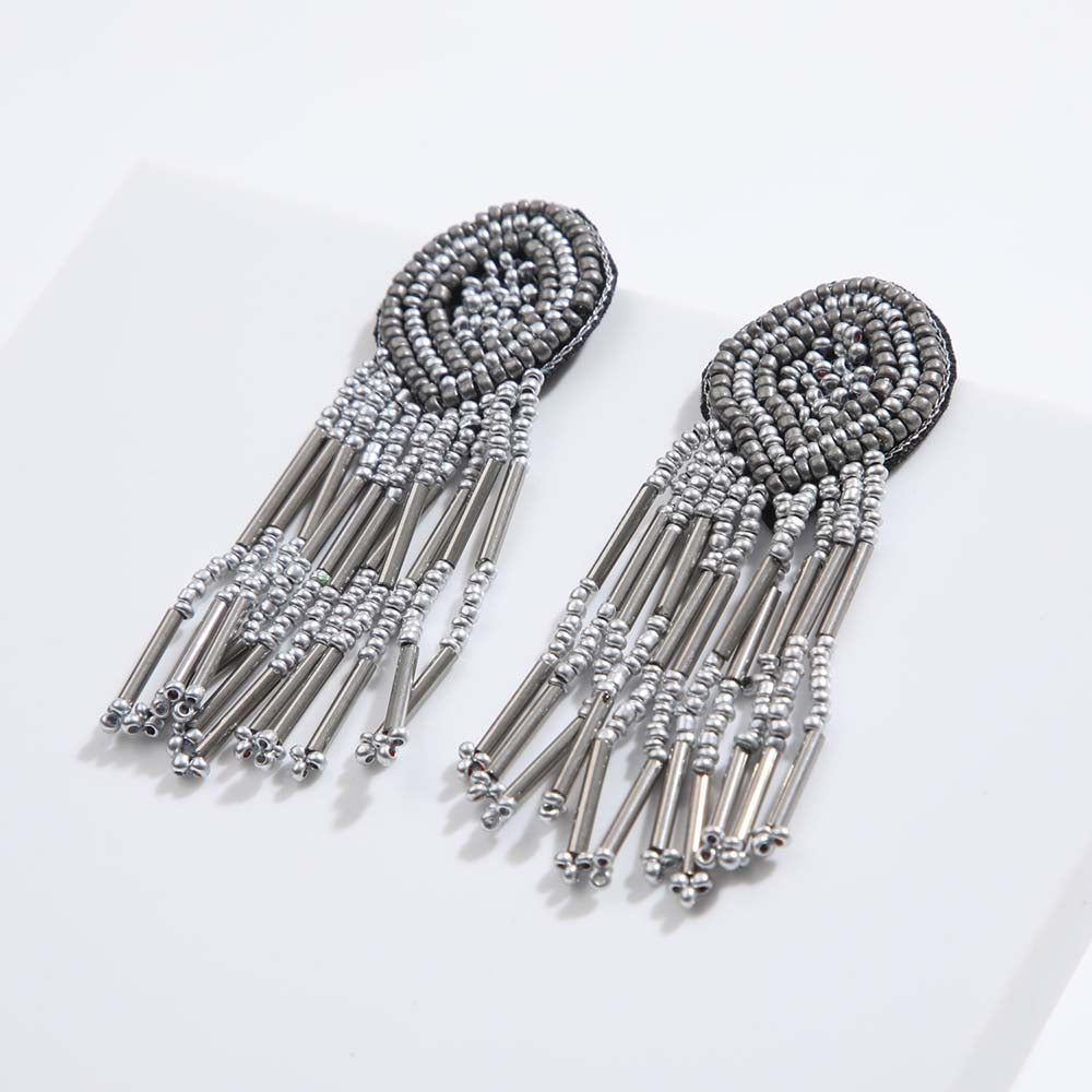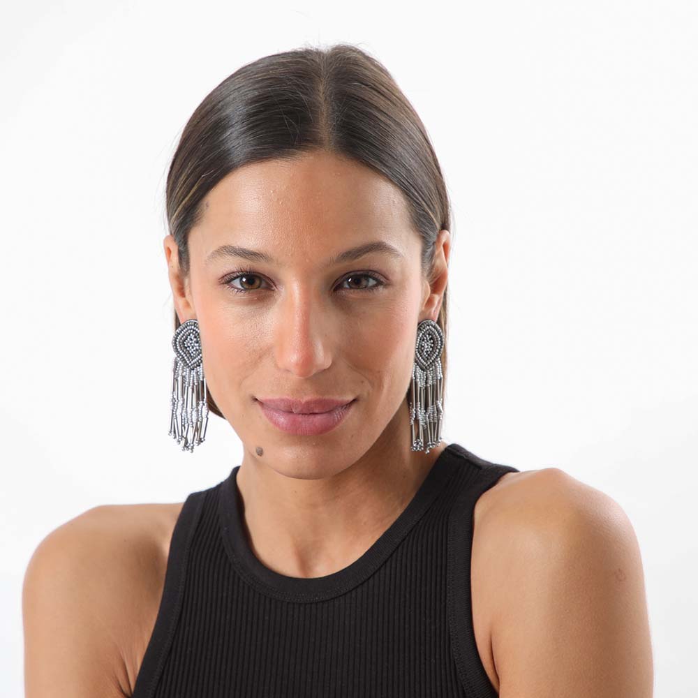 Aros Humana Abelia largos plateados que ´pertenecen a la colección Coastal Breeze. Aros de mostacillas combinados con dos tonos de plateados.