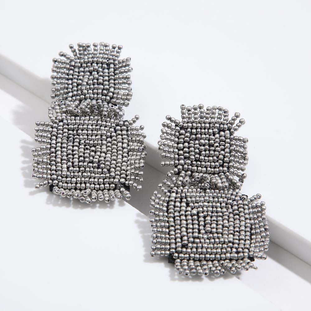 Aros Humana Largos Agapanto largos plateados que pertenecen a la colección Pink Diamond. Aros de mostacillas en forma cuadrada.