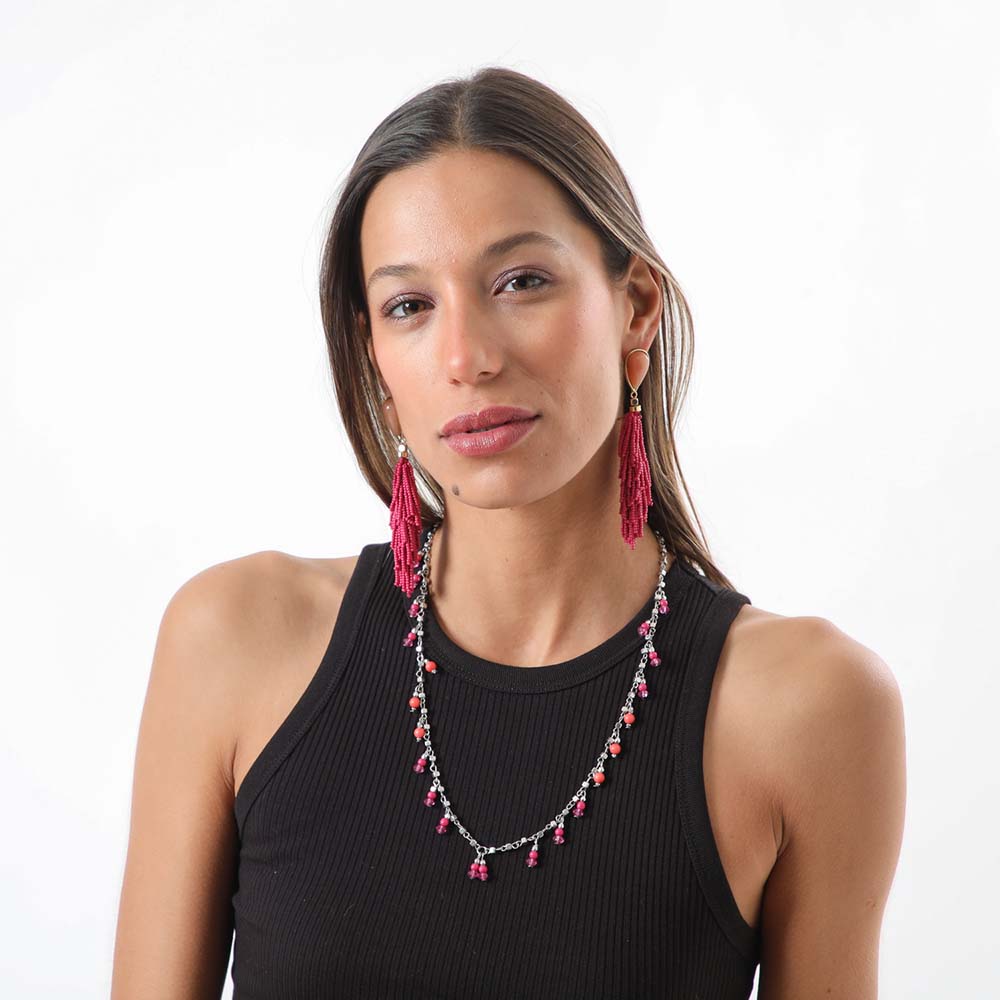 Aros Humana Alicante largo fucsia que pertenecen a la colección Floral Nature. Aros con piedra real combinado con tiras de mostacillas.