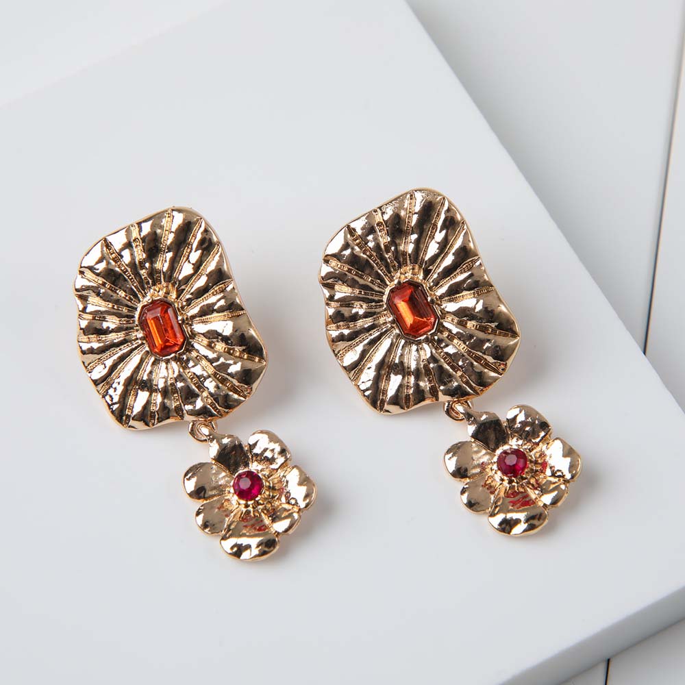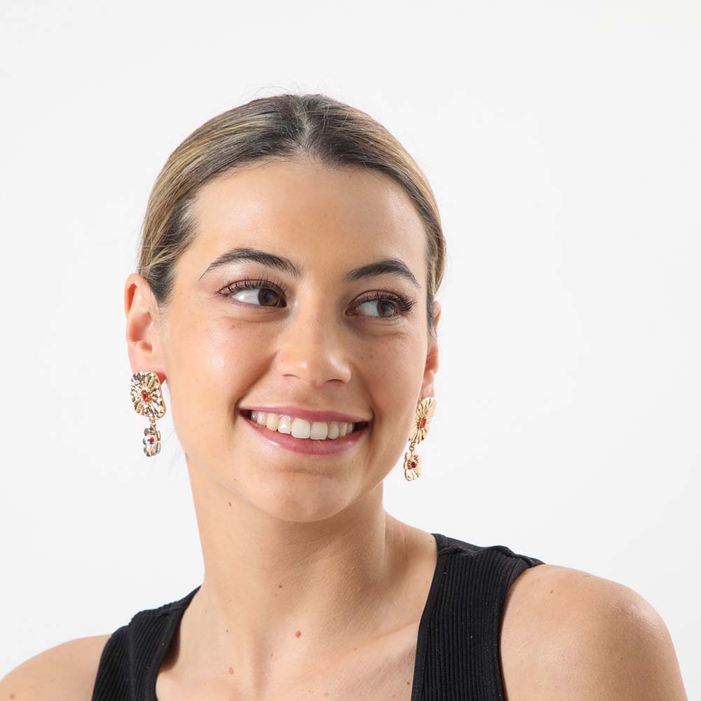 Aros iD Arcoiris largos dorados. Aros compuesto de dos piezas con piedra roja en el centro.